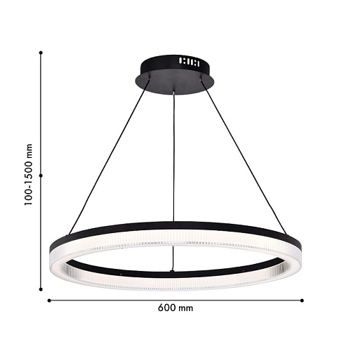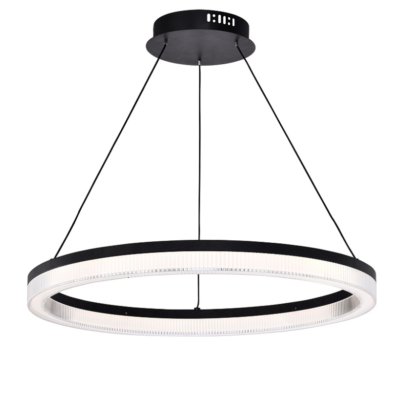 Подвесная люстра с черным каркасом, декоративный акриловый плафон со сложным многослойным оптическим узором, регулируемая высота.
