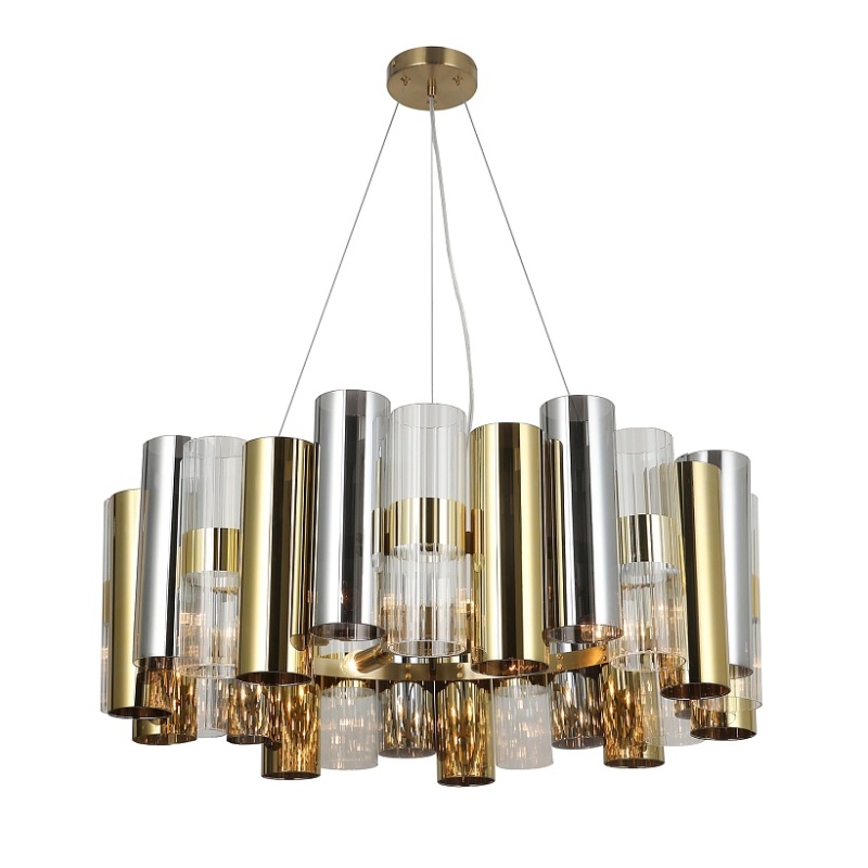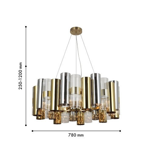 Каркас в цвете золото, декор плафона из стеклянных цилиндров, соединенных между собой, плафоны выполнены в трех цветах: зеркальный хром, зеркальное золото и прозрачный с декоративным рифлением и золотым ободком.