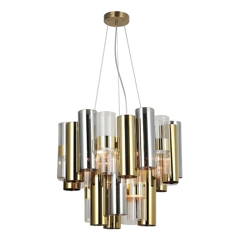 Каркас в цвете золото, декор плафона из стеклянных цилиндров, соединенных между собой, плафоны выполнены в трех цветах: зеркальный хром, зеркальное золото и прозрачный с декоративным рифлением и золотым ободком.