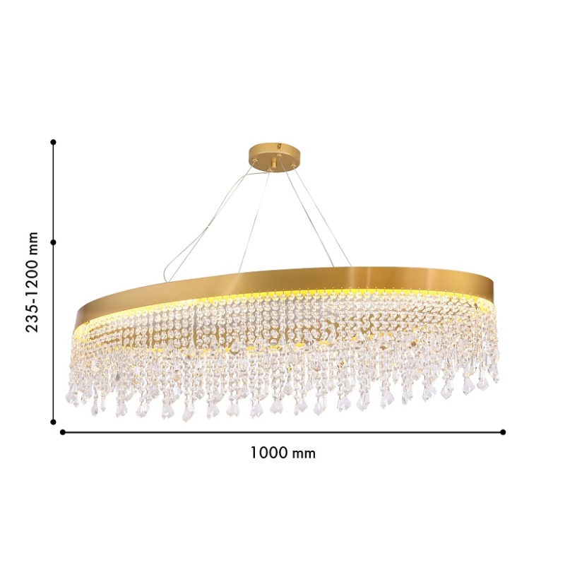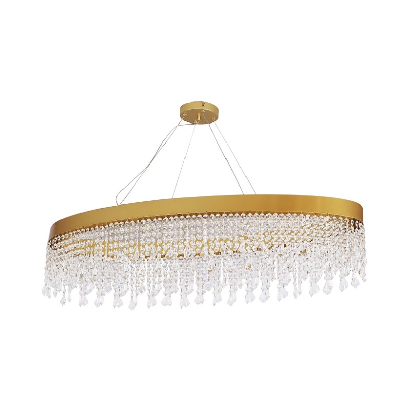 Овальная люстра с каркасом в цвете латунь, хрустальные подвески высшего качества, встроенная лента со светодиодами внутри кольца, регулируемая высота, пуль управления.