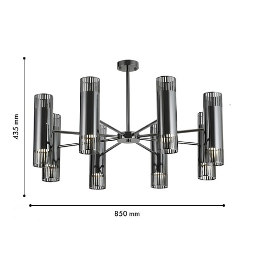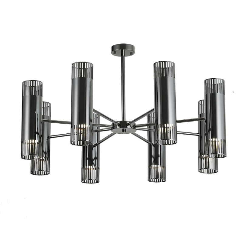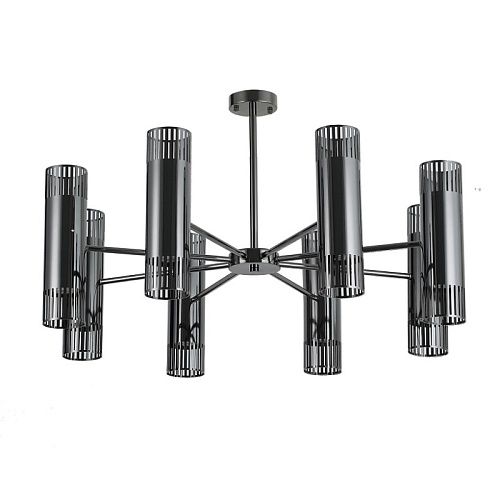 Каркас люстры в цвете черных хром, плафоны в форме удлиненного цилиндра с декоративными прорезями по краям, два источника света внутри плафонов, направленные вверх и низ, сменная лампа G9.