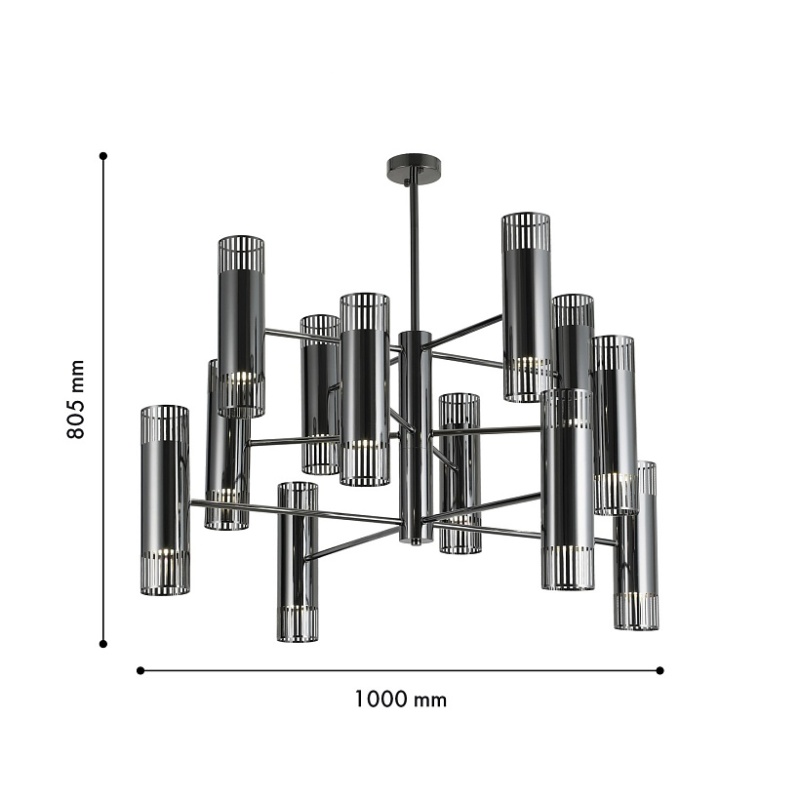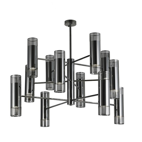 Каркас люстры в цвете черных хром, плафоны в форме удлиненного цилиндра с декоративными прорезями по краям, два источника света внутри плафонов, направленные вверх и низ, сменная лампа G10.