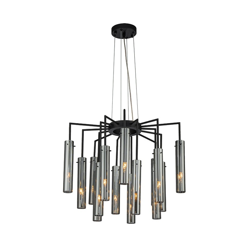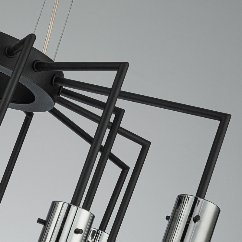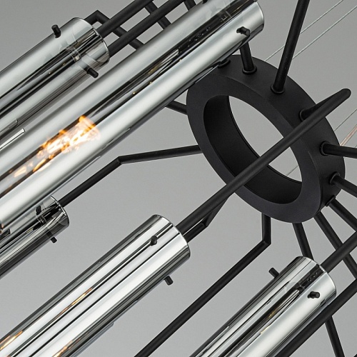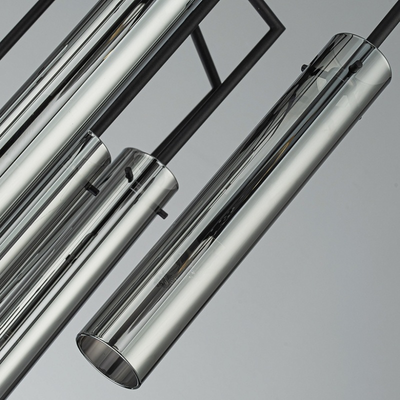 Каскадная люстра, каркас черного цвета, состоит из металлических трубок, изогнутых от центрального кольца под прямым углом, на конце каждой трубки расположен тонкий длинный плафон из стекла дымчато-серого цвета. сменная лампа G9, регулируемая высота.