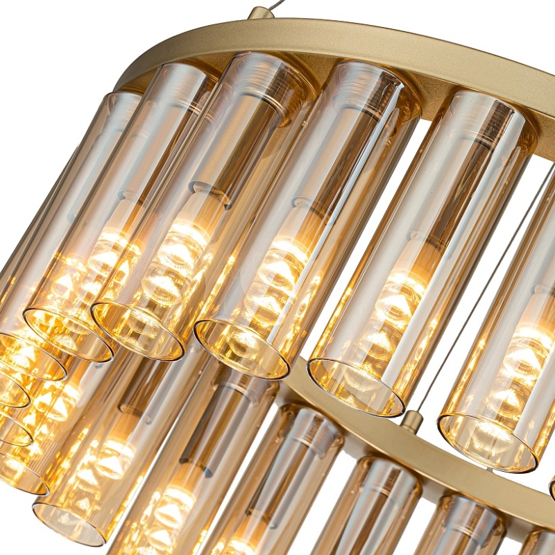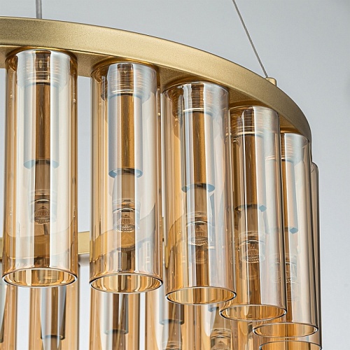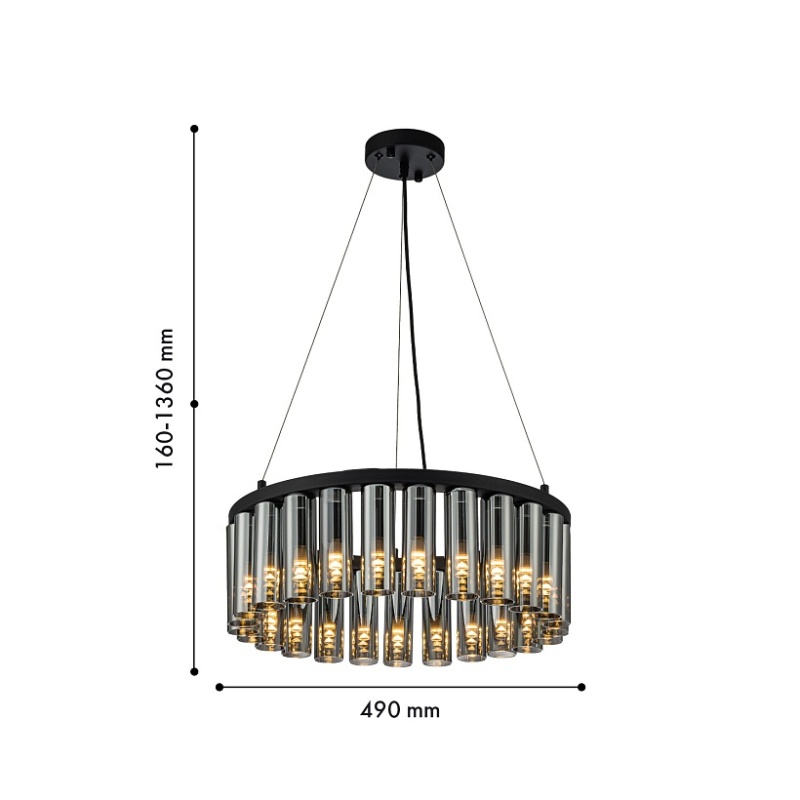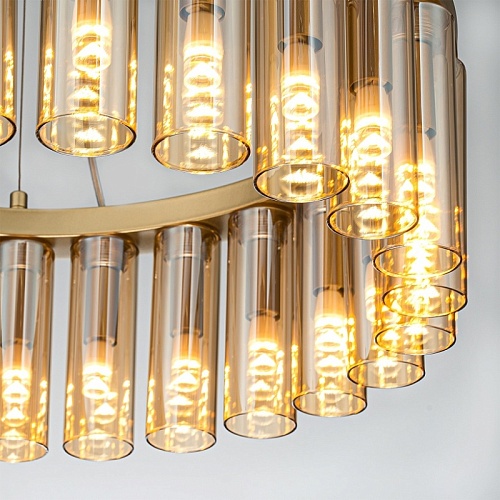 Металлический каркас черного цвета, плафоны из стекла дымчато-серого цвета цилиндрической формы. Сменные лампы G9. Универсальные крепления позволяют создавать конструкцию из нескольких колец.
