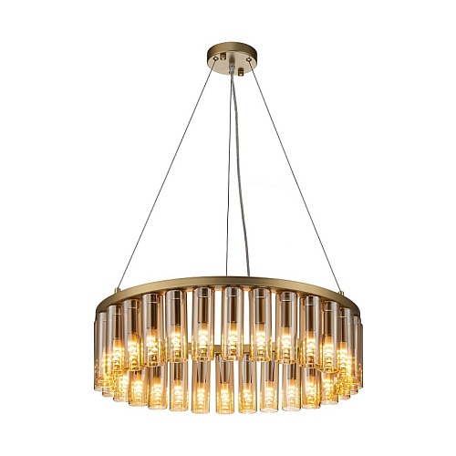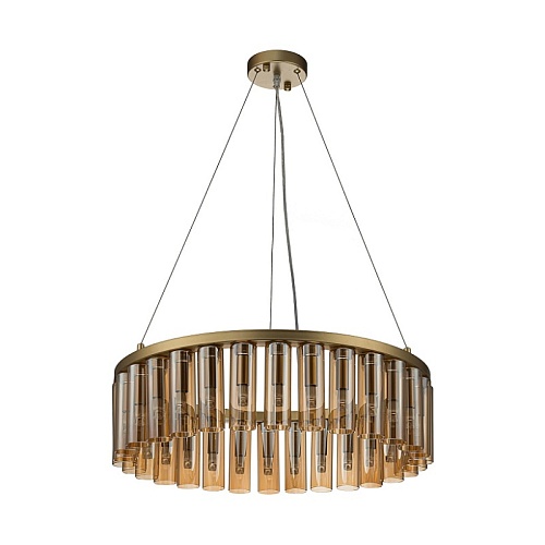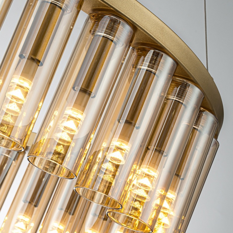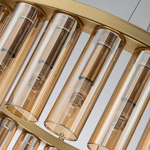 Металлический каркас в цвете латунь, плафоны из стекла янтарного цвета цилиндрической формы. Сменные лампы G9. Универсальные крепление позволяют создавать конструкцию из нескольких колец.