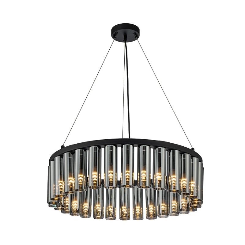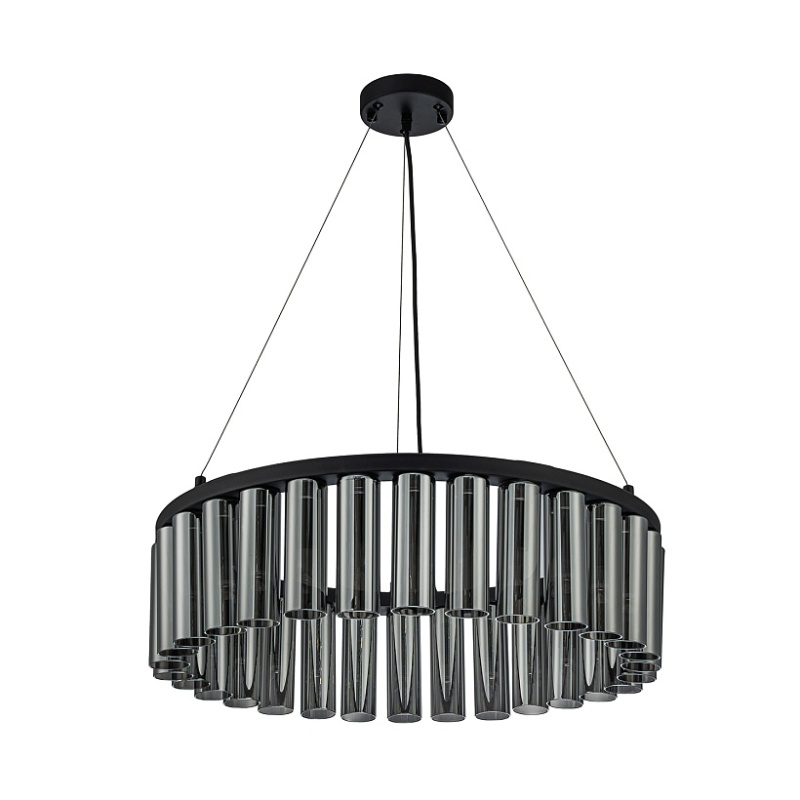 Металлический каркас черного цвета, плафоны из стекла дымчато-серого цвета цилиндрической формы. Сменные лампы G9. Универсальные крепления позволяют создавать конструкцию из нескольких колец.