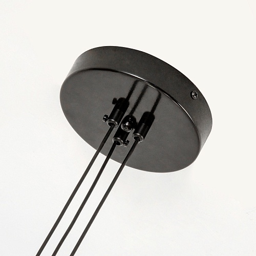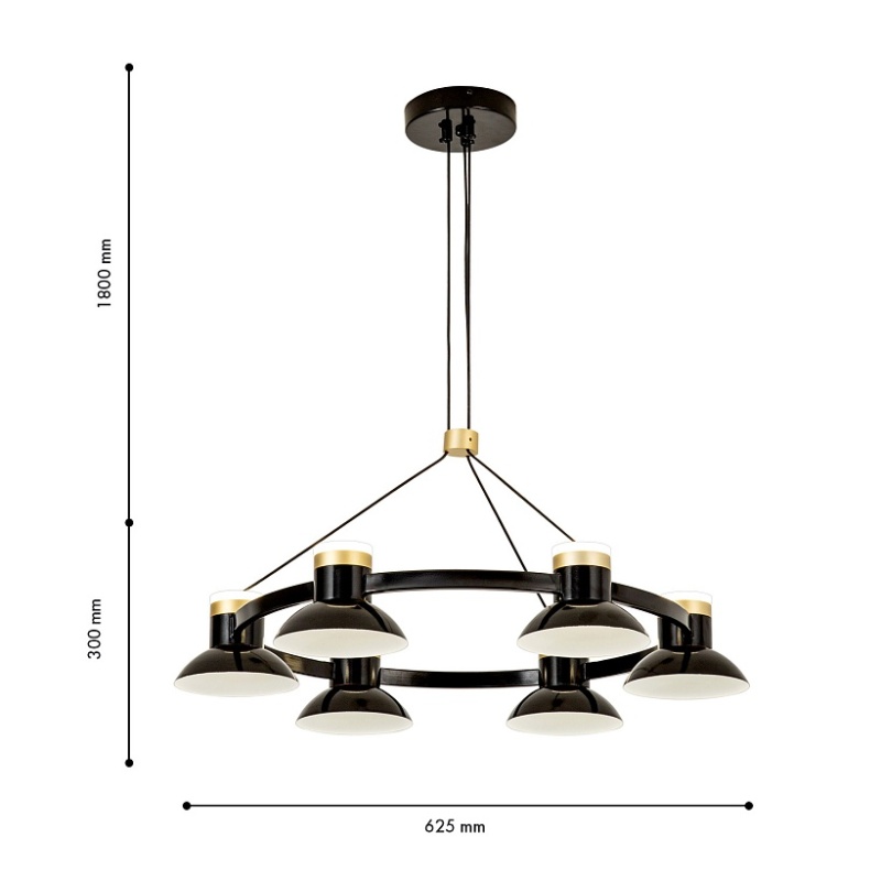 Черный глянцевый металлический каркас, акриловый плафон внутри абажура, дополнительный декоративный источник света в верхней части абажура, декоративный элемент из металла в цвете матовое золото.