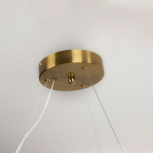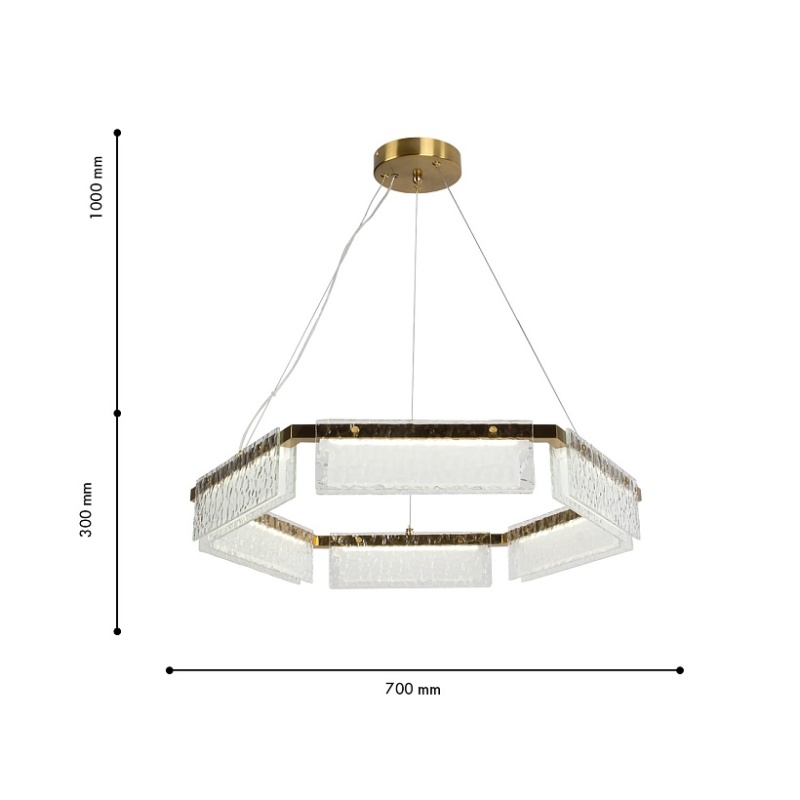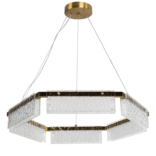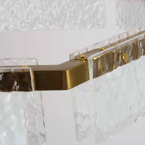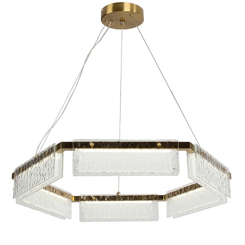 Люстра в форме шестигранника, металлический каркас в цвете латунь, плафон в виде акрилового прямоугольника со встроенной LED-лентой и декоративной стеклянной пластиной с эффектом тающего льда, пластины крепятся с двух сторон декоративными креплениями.