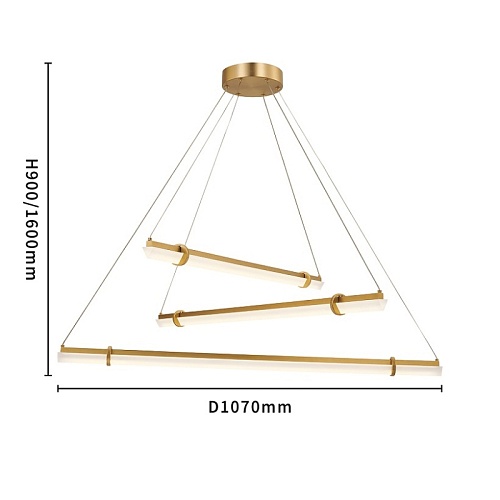Металлический каркас в матовом латунном цвете и акриловый плафон белого цвета, имеющий форму треугольного бруска. Элементы плафона скреплены декоративными крепежами.