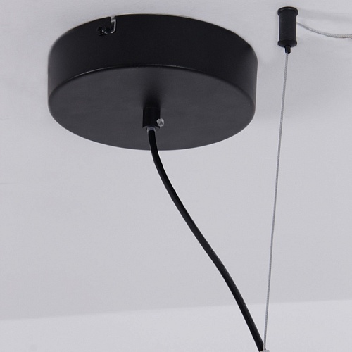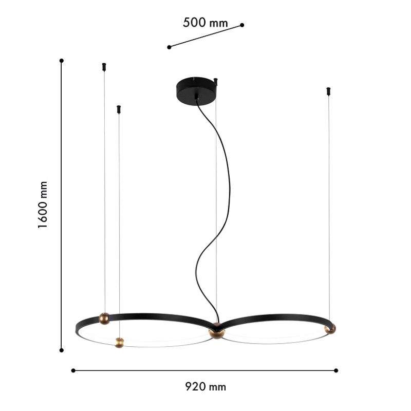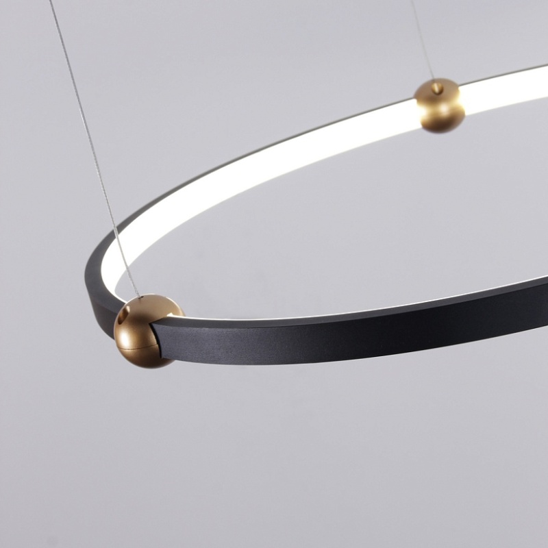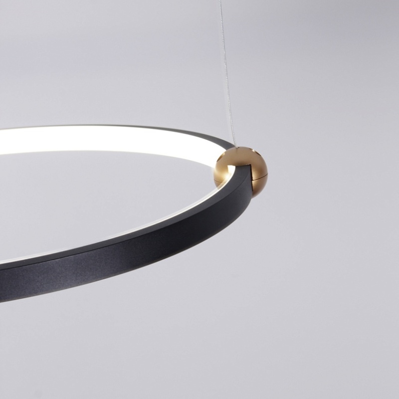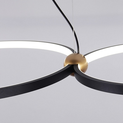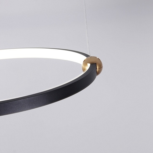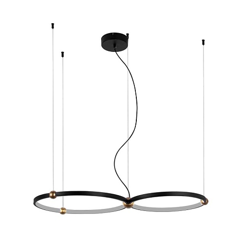 Люстра, составленная из колец разных размеров, собранных в композицию. Каркас в черном цвете, декоративные элементы в виде шаров в цвете матовое золото, встроенная LED-лента, рассеиватель из белого акрила, регулируемая высота.