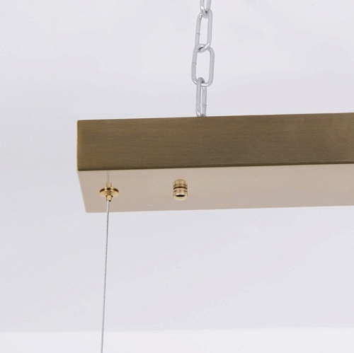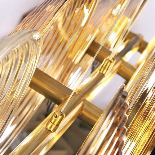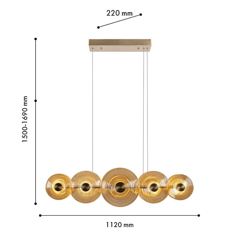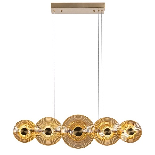 Металлический каркас в цвете латунь, плафоны из стекла янтарного цвета с объемной структурой колец, встроенный LED-модуль, регулируемая высота.