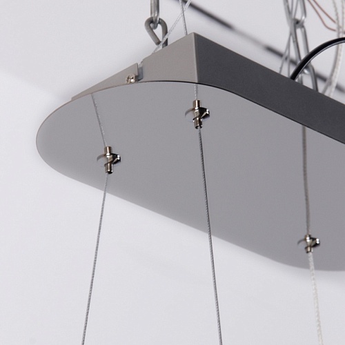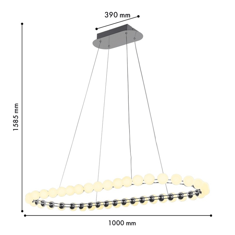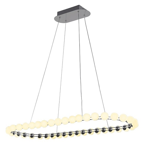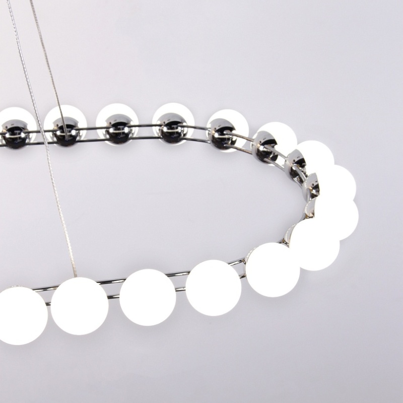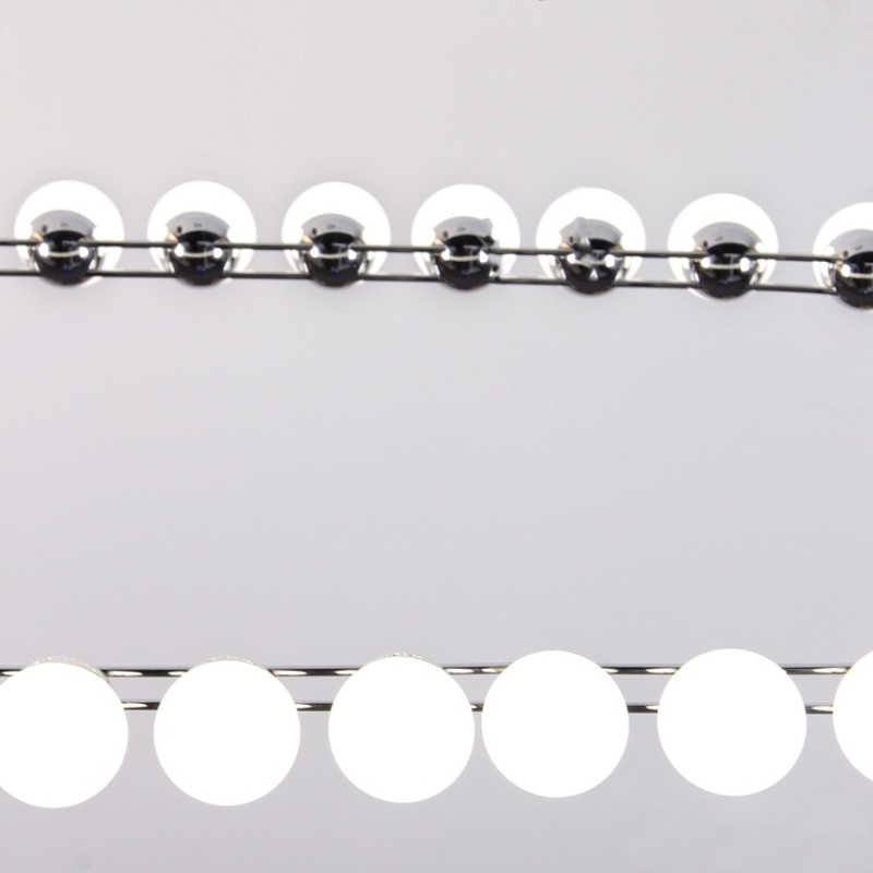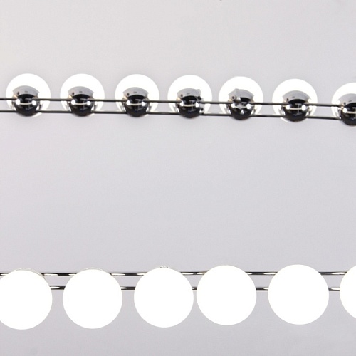 Металлический хромированный каркас, плафоны в форме белых акриловых шариков.
