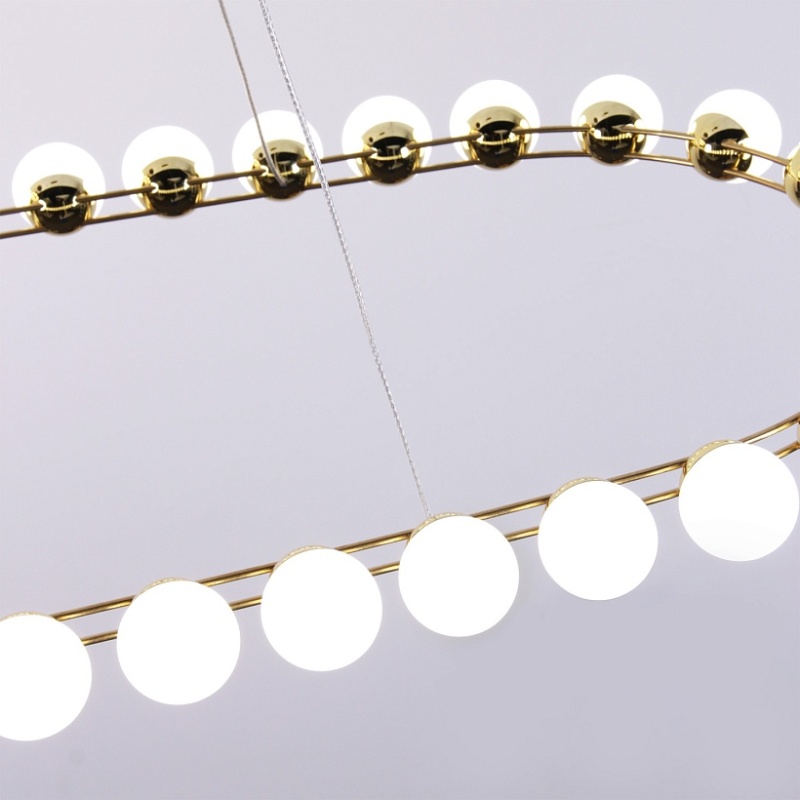 Металлический каркас в цвете латунь, плафоны в форме белых акриловых шариков.