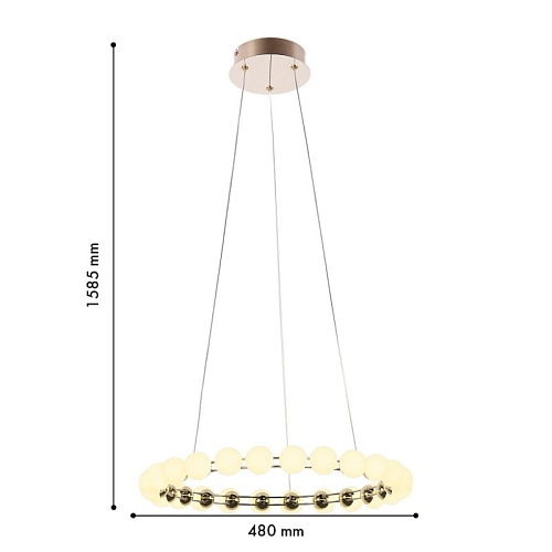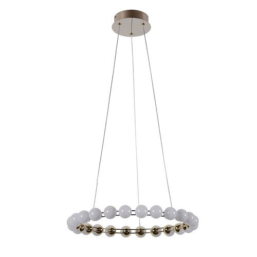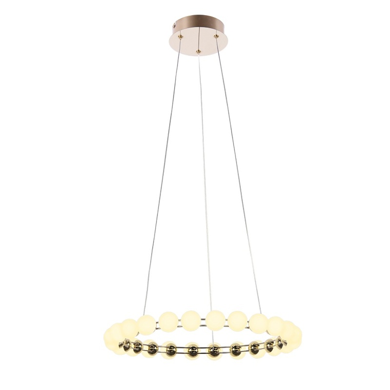 Металлический каркас в цвете латунь, плафоны в форме белых акриловых шариков.