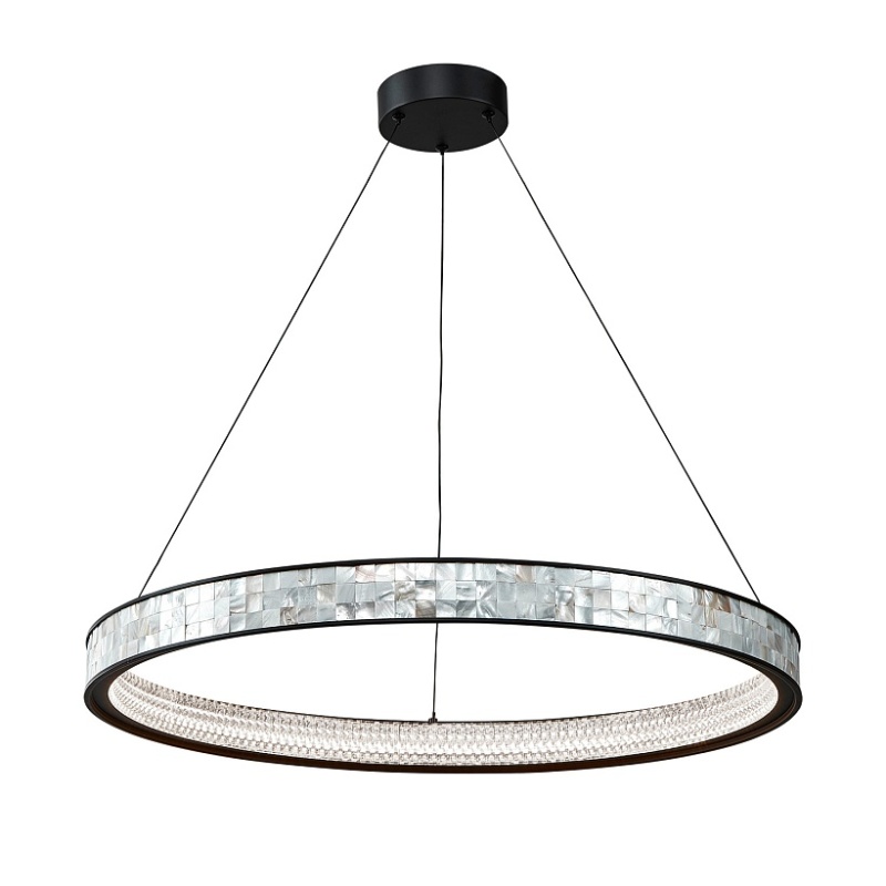 Металлический каркас черного цвета, LED-лента с рассеивателем из прозрачного поликарбоната, внешняя сторона плафона декорирована перламутровыми квадратиками из морских ракушек, регулируемая высота.