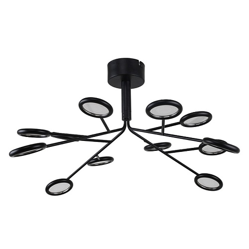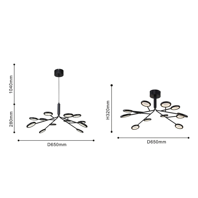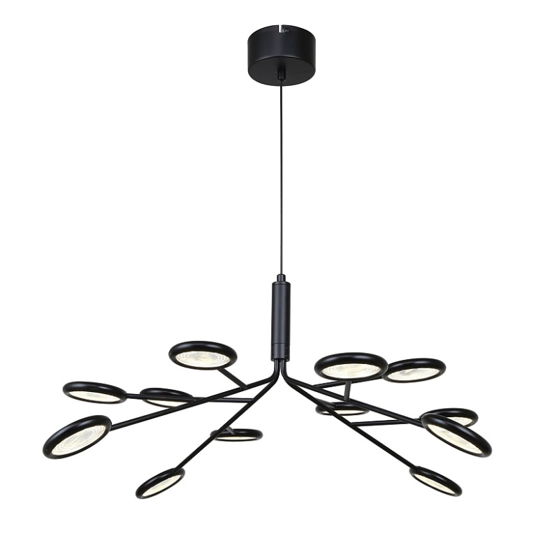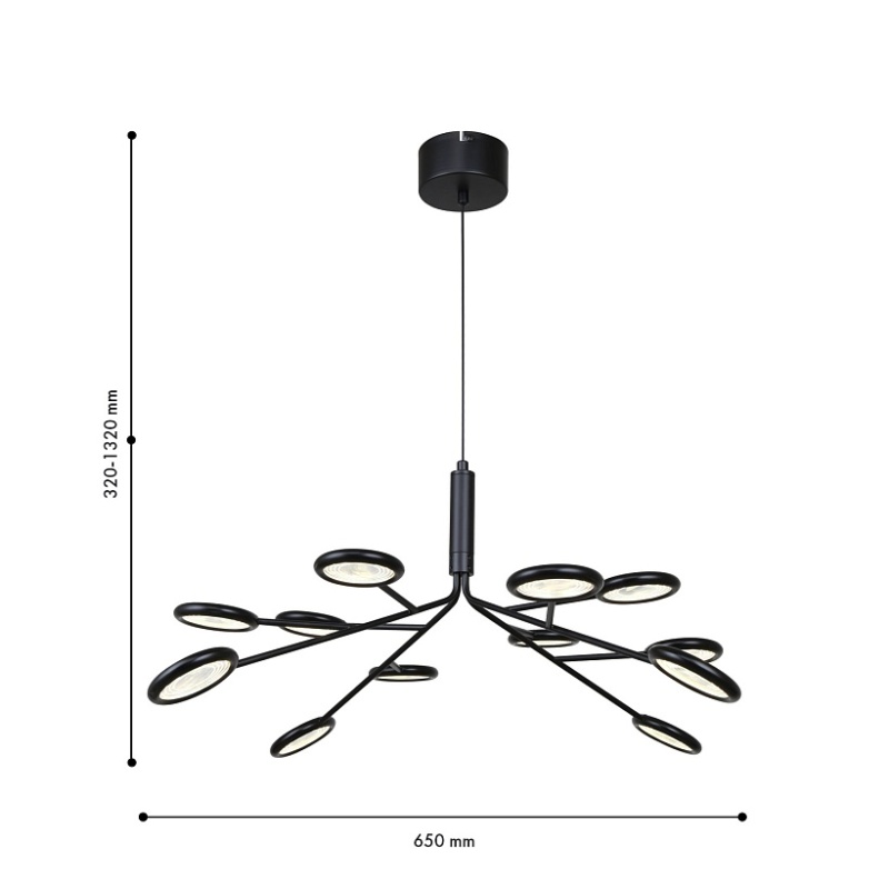 Металлический каркас матового черного цвета, внутренний периметр плафонов подсвечен лентой-LED, рассеиватель из акрила с нанесенным на него круговым узором, регулируемая высота.