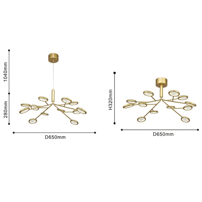 Металлический каркас в цвете матовое золото, внутренний периметр плафонов подсвечен лентой-LED, рассеиватель из акрила с нанесенным на него круговым узором, регулируемая высота.