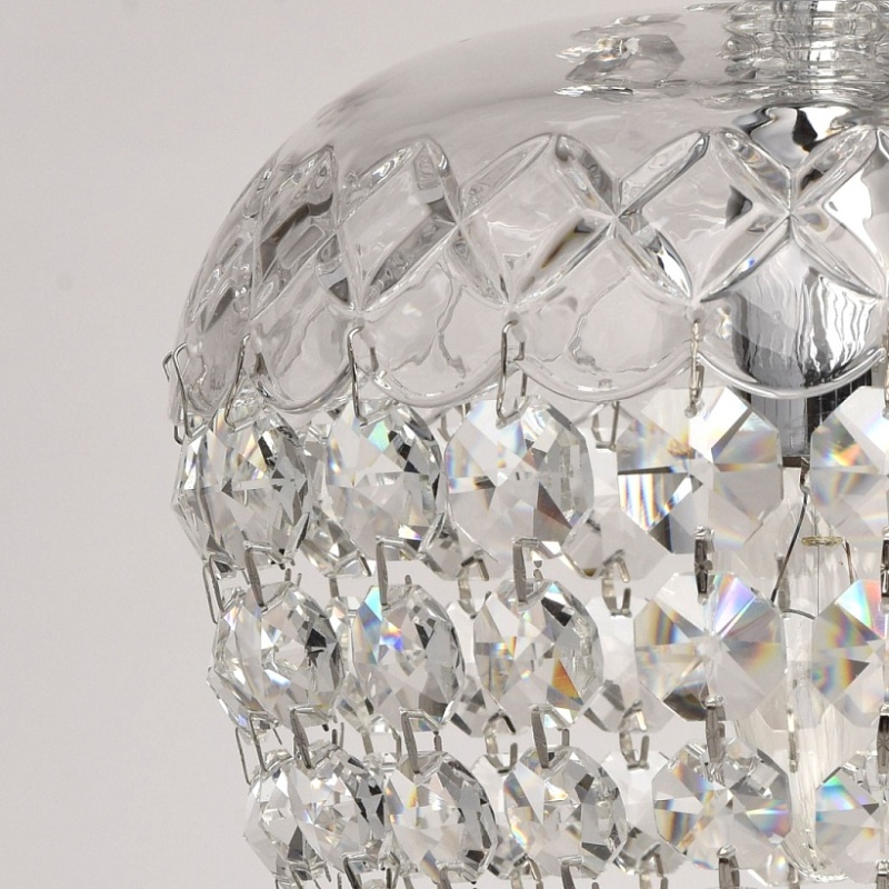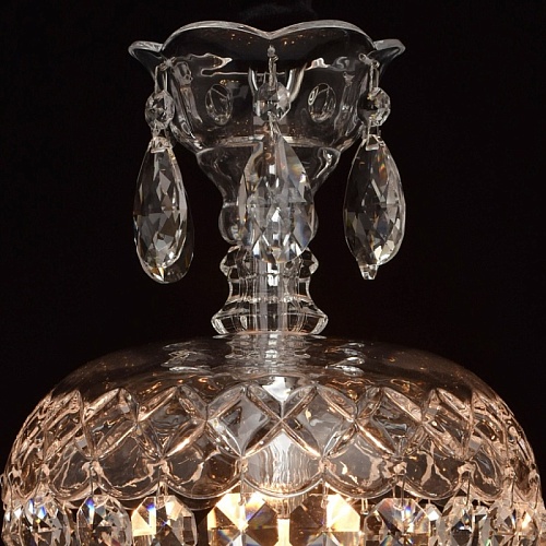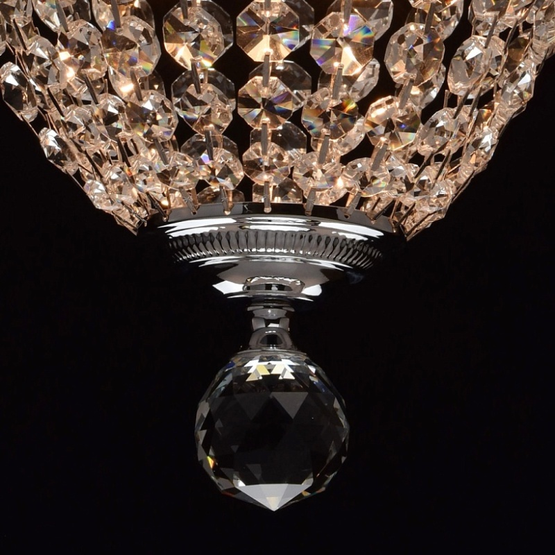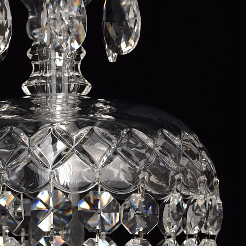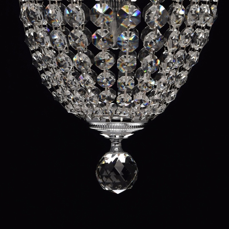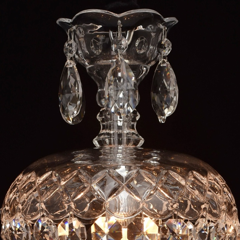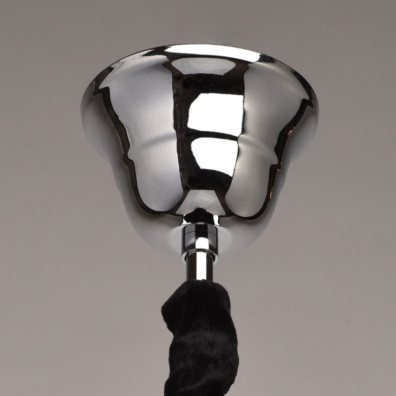 Арматура: основание светильника выполнено из металла по технологии обработки на токарном станке, гальванизировано в цвет хром. Розетки из прозрачного гутного стекла. Плафон декорирован прозрачными хрустальными элементами. Декоративная гайка в виде хрустального шара. Бархатный чехол для подвеса черного цвета.