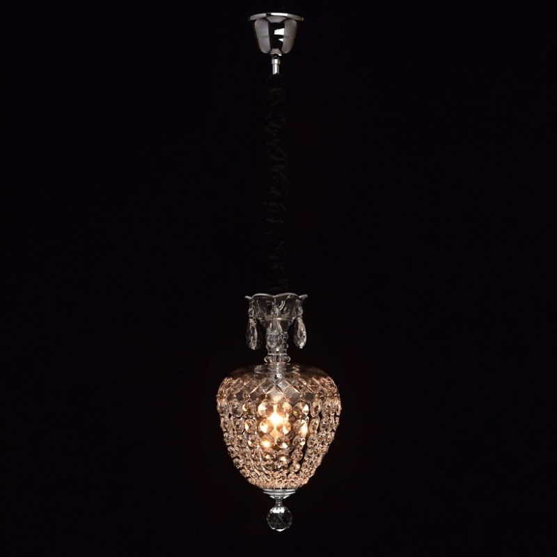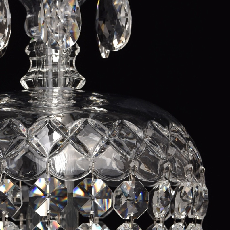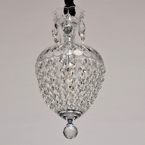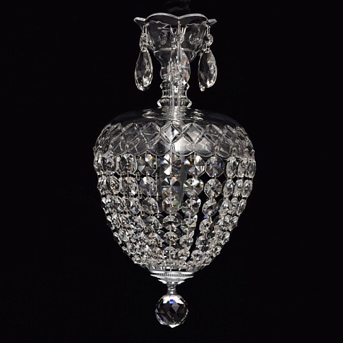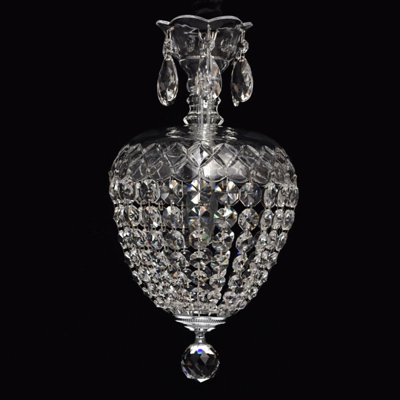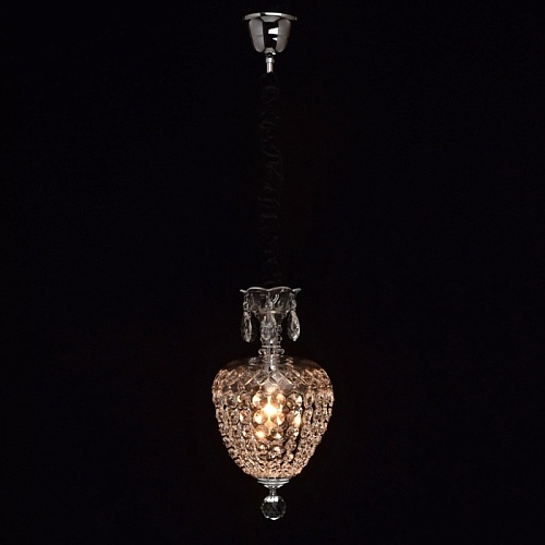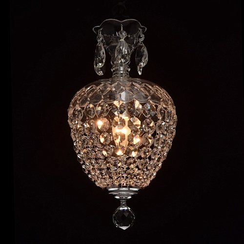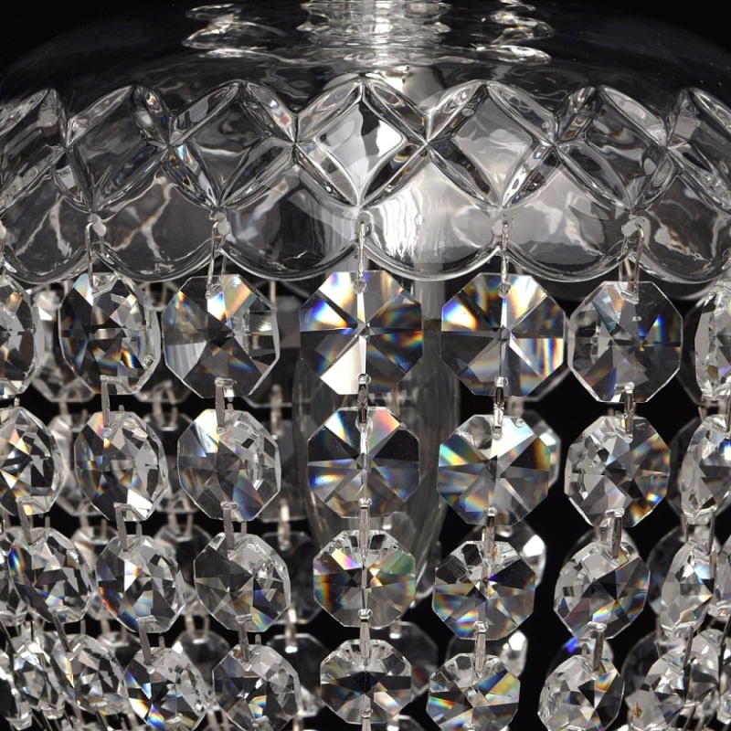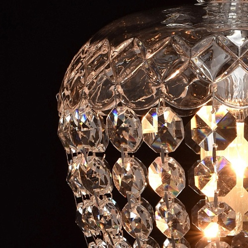 Арматура: основание светильника выполнено из металла по технологии обработки на токарном станке, гальванизировано в цвет хром. Розетки из прозрачного гутного стекла. Плафон декорирован прозрачными хрустальными элементами. Декоративная гайка в виде хрустального шара. Бархатный чехол для подвеса черного цвета.