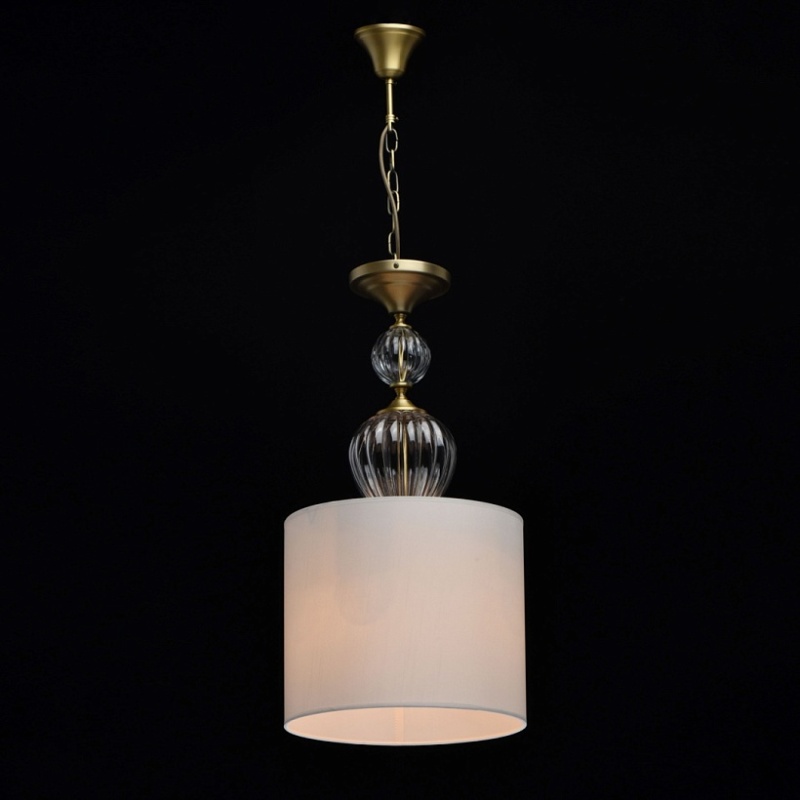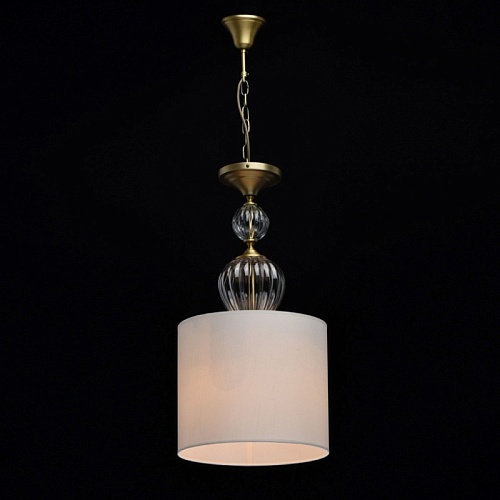 Основание светильника выполнено из металла и гальванизировано в цвет латуни. Светильник декорирован выдувным стеклом ручной работы. Текстильный абажур белого цвета с термостойким акрилом внутри. Края абажура отделаны кантом, абажур прошит.