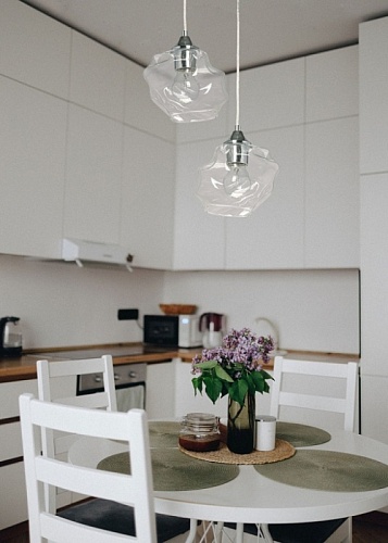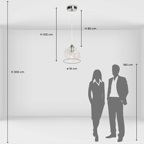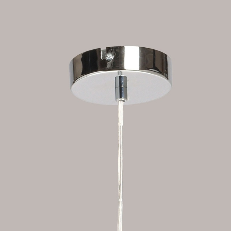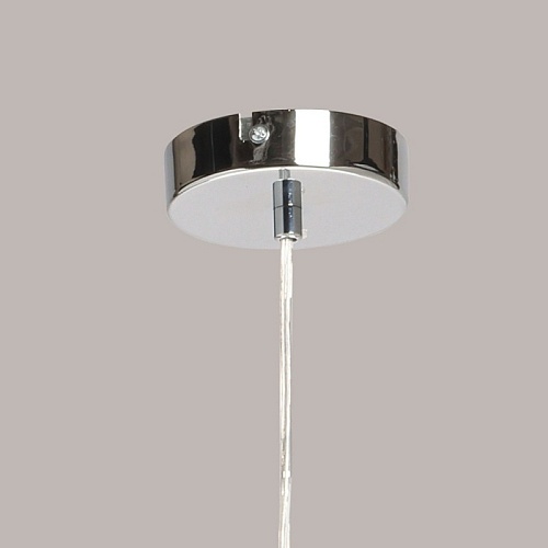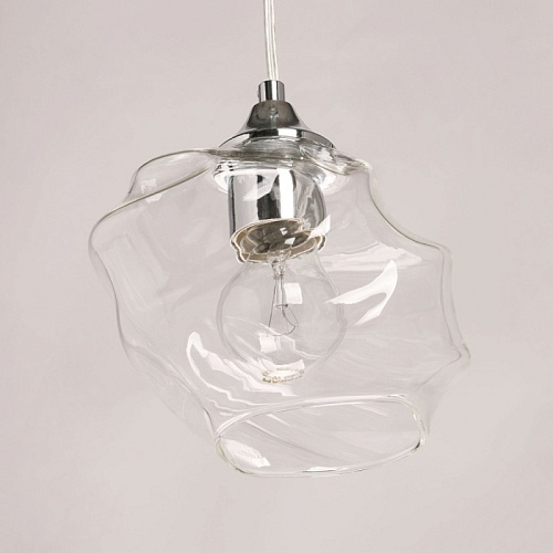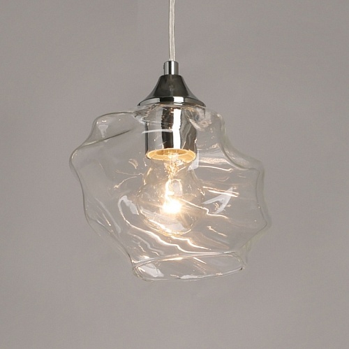 Металлическое основание подвеса гальванизировано в цвет хрома. Плафон отлит из прозрачного стекла оригинальной формы.