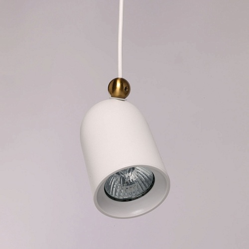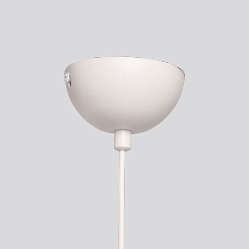 Металлическое основание подвеса окрашено в белый цвет. Корпус плафона выполнен из сплава алюминия и окрашен в цвет основания. Подвес декорирован металлической сферой, гальванизированной в цвет латуни.