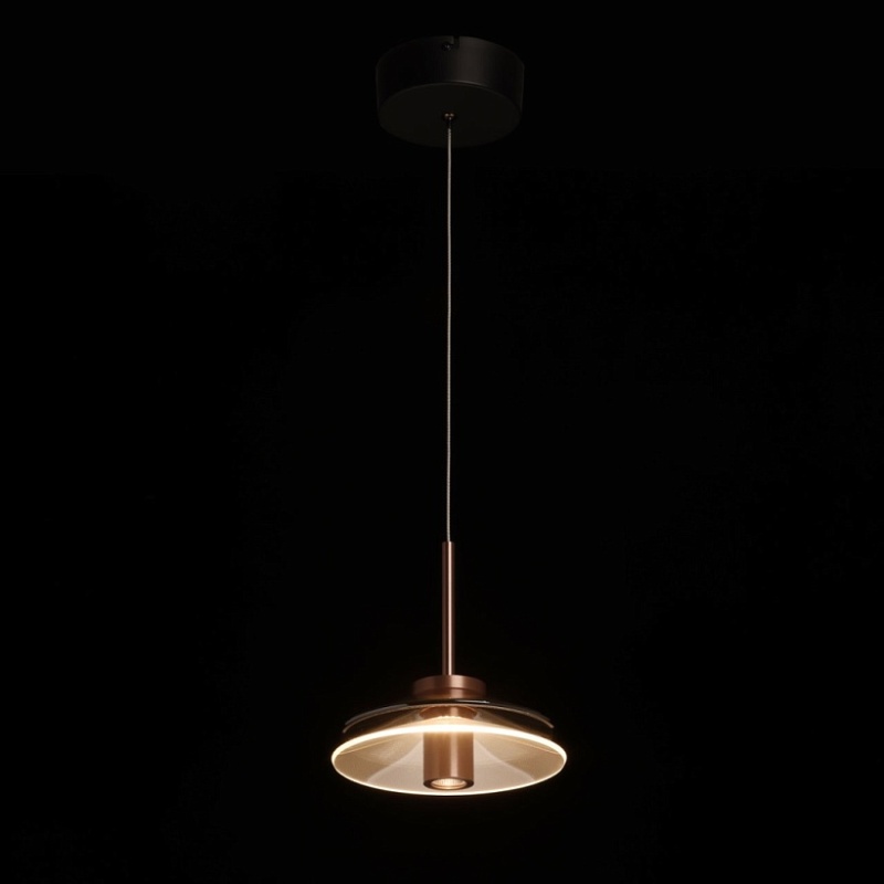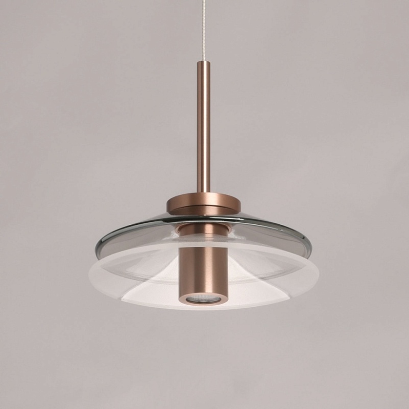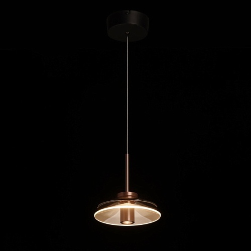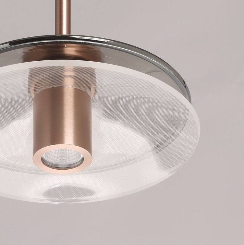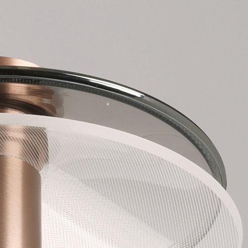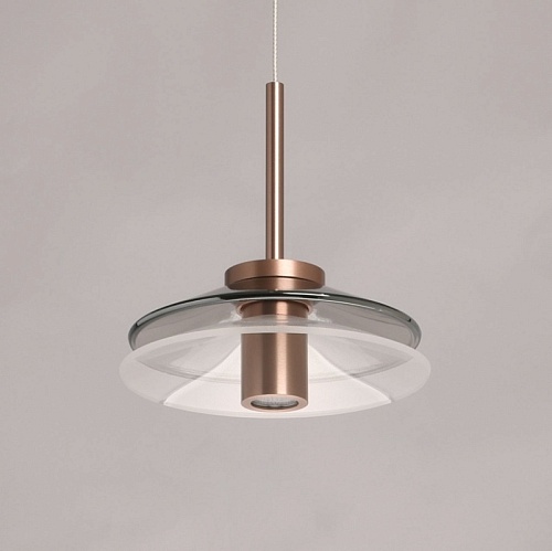 Потолочная чаша подвеса выполнена из металла и окрашена в черный цвет. Корпус плафонов выполнен из сплава алюминия с цинком и анодирован в цвет меди. Двойной плафон выполнен из гальванизированного в дымчатый цвет стекла и прозрачного акрила.
