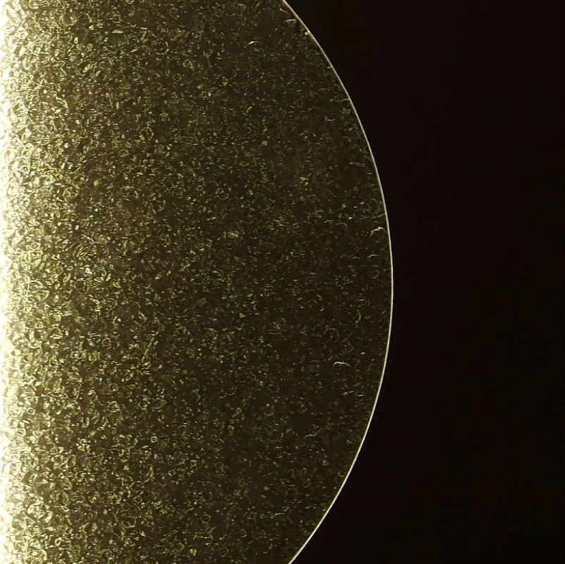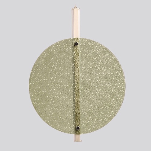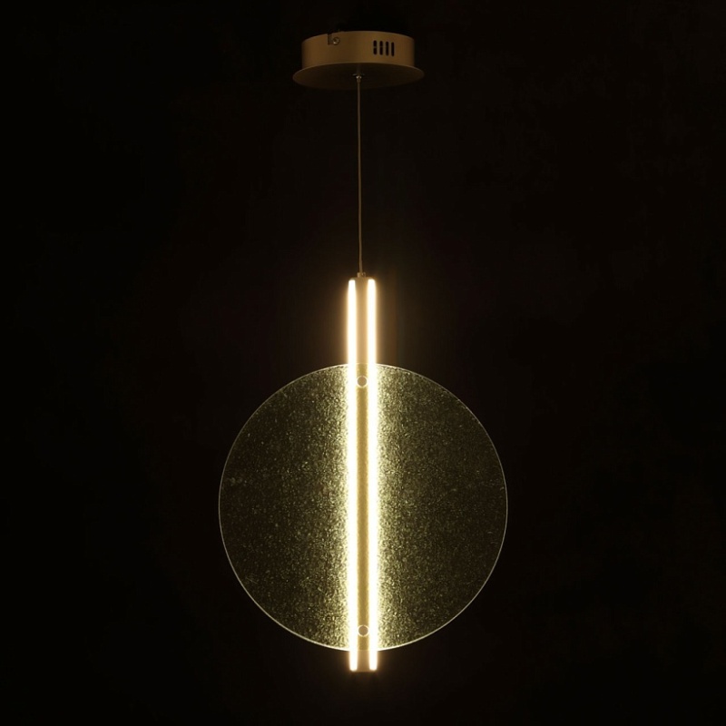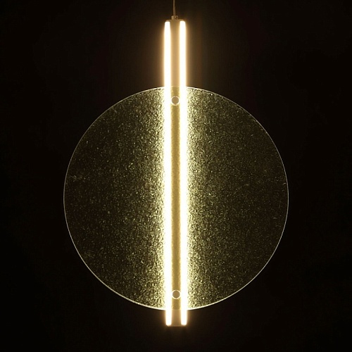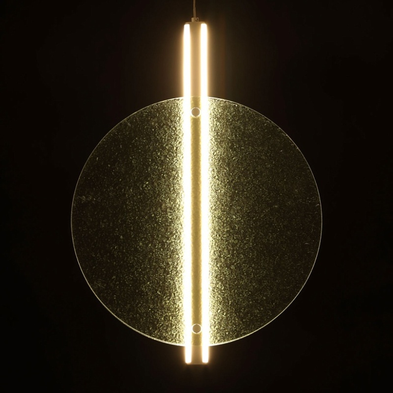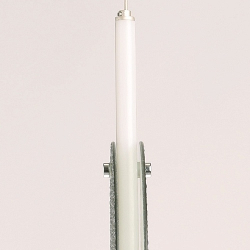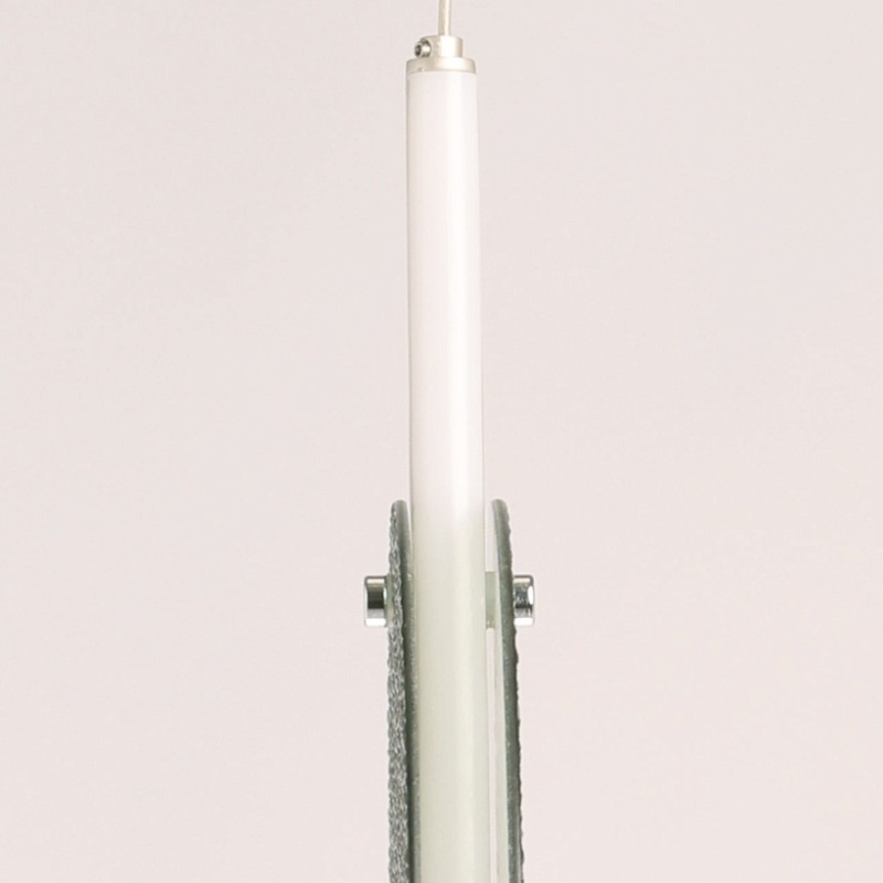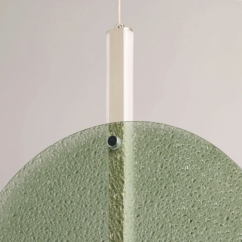 Металлическое основание подвеса гальванизировано в цвет никеля. Корпус плафона выполнен из сплава алюминия с цинком и гальванизирован в цвет основания. Светодиодные источники света закрыты матовым акрилом. Подвес декорирован фактурным стеклом, окрашенным в массе в зеленый цвет.
