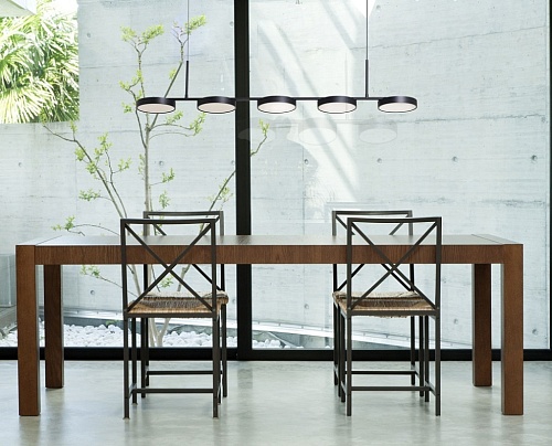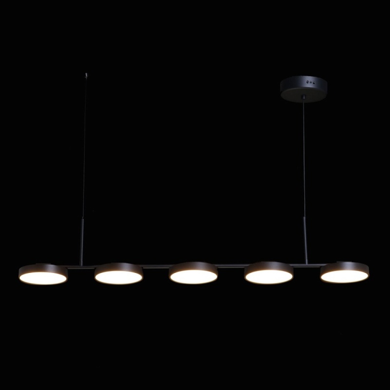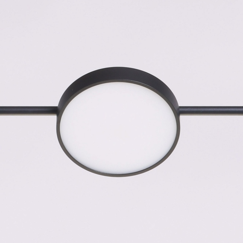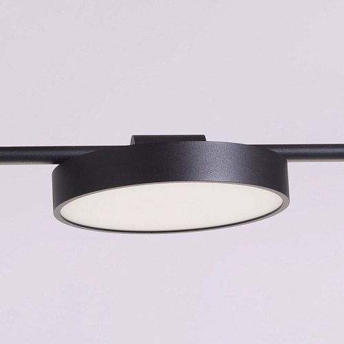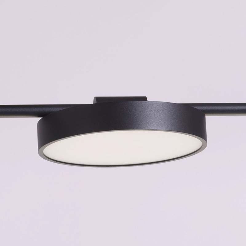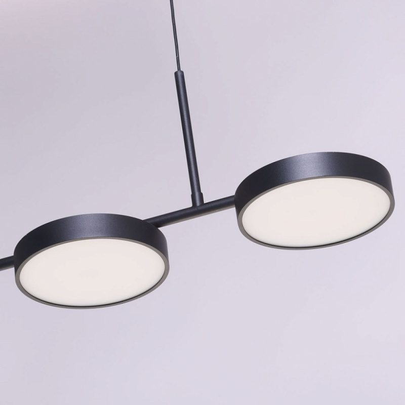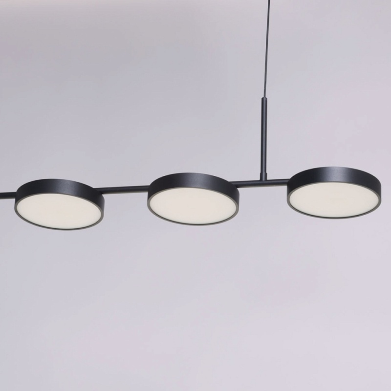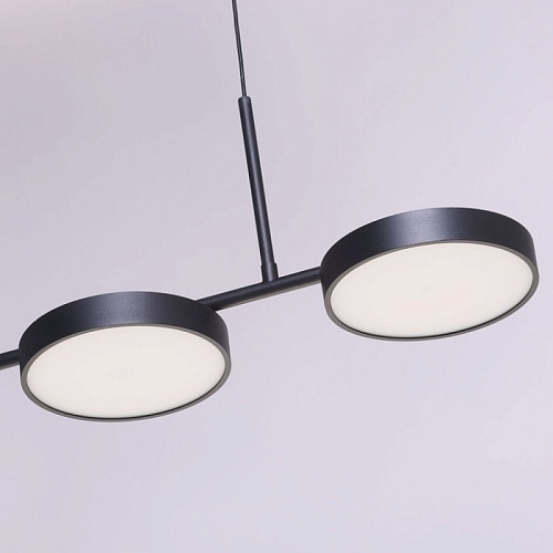Металлическое основание подвесной люстры окрашено в черный цвет. Плафоны выполнены из сплава алюминия и окрашены в цвет основания. Светодиодные источники света закрыты белым матовым акрилом.В комплект входит пульт.