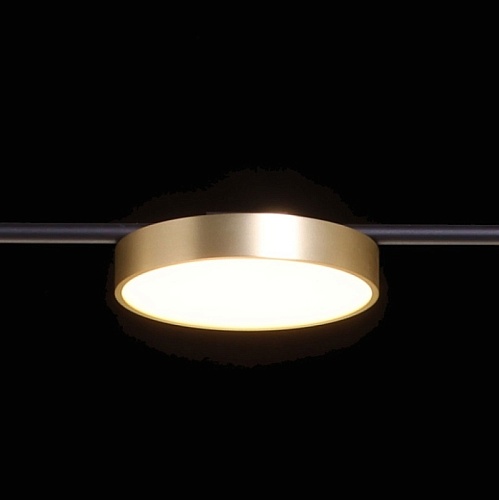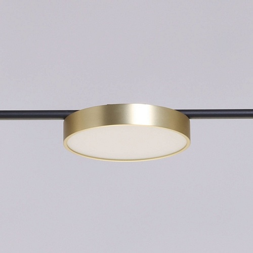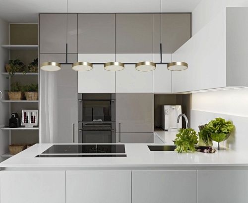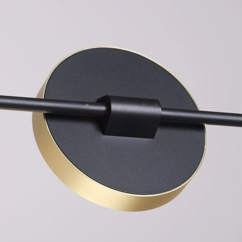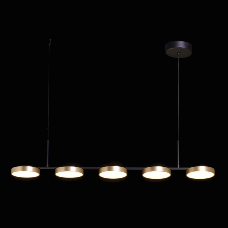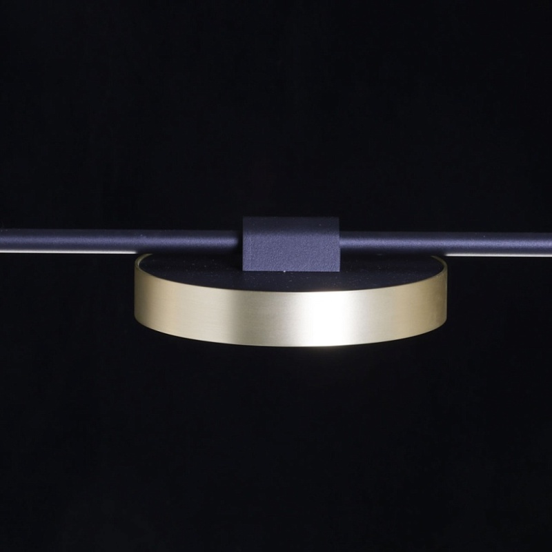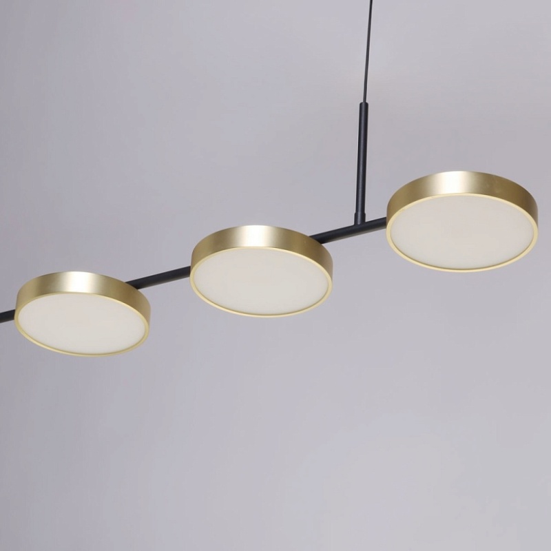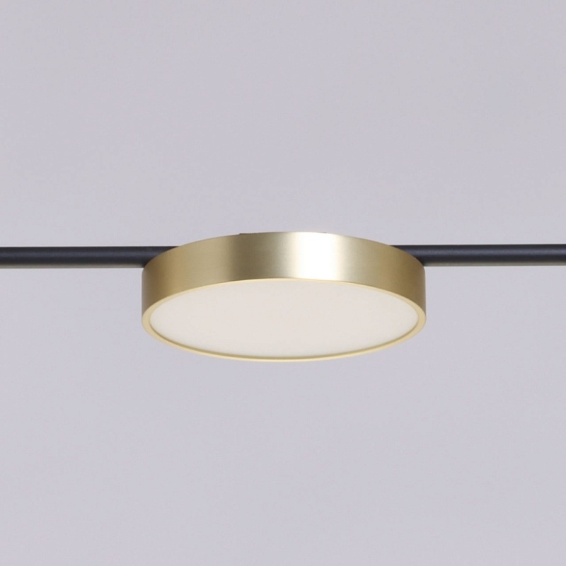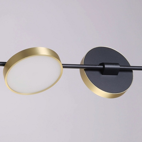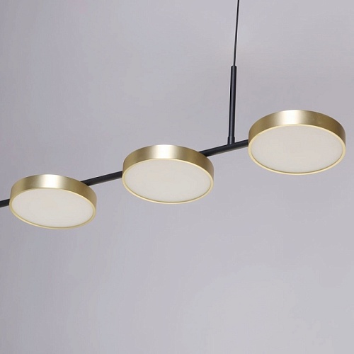 Металлическое основание подвесной люстры окрашено в черный цвет. Плафоны выполнены из сплава алюминия и гальванизированы в цвет золота. Светодиодные источники света закрыты белым матовым акрилом.В комплект входит пульт.