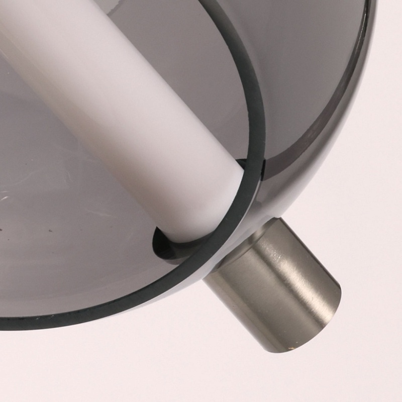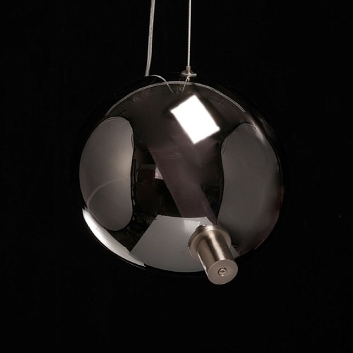 Металлическое основание подвеса гальванизировано в цвет никеля. Светодиодный источник света закрыт акрилом белого цвета. Подвес декорирован оригинальным плафоном из стекла, гальванизированного в дымчатый цвет.. Декоративный металлический держатель плафона гальванизирован в цвет основания.