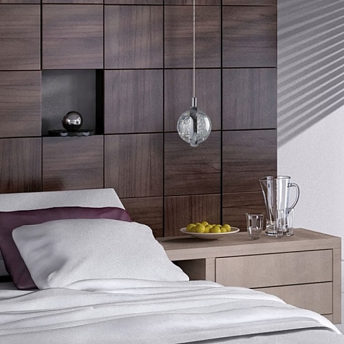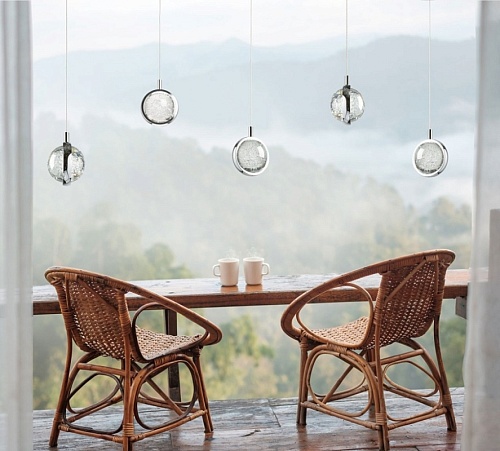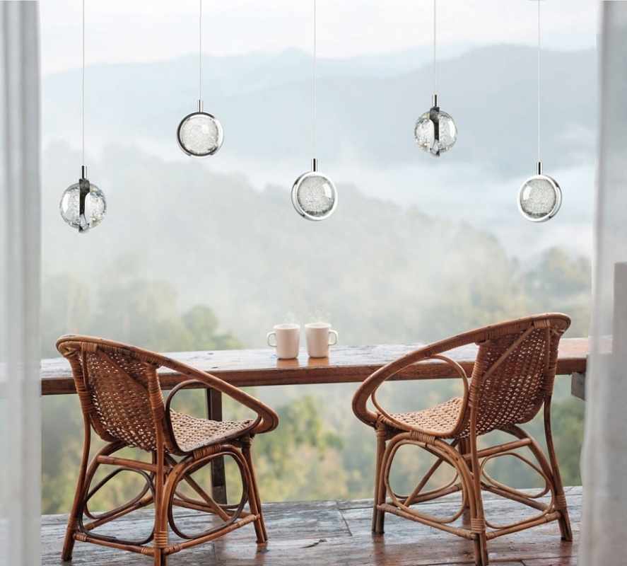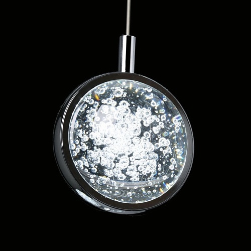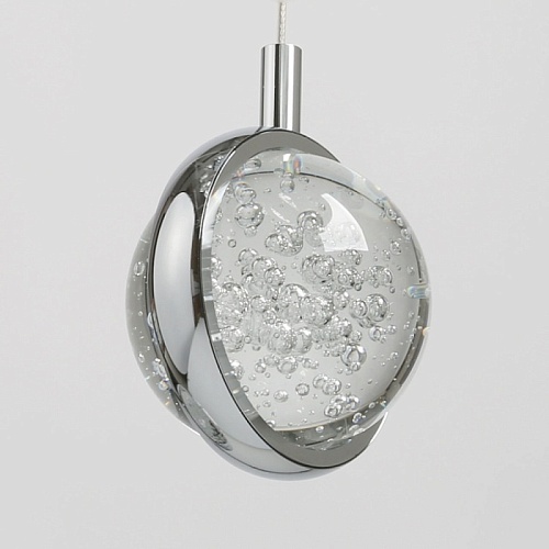 Основание светильника выполнено из сплава алюминия с цинком, обработано по технологии брашинга и гальванизировано в цвет хрома. Светодиодный источник света закрыт сферой из стекла с включениями пузырьков.