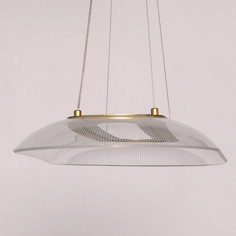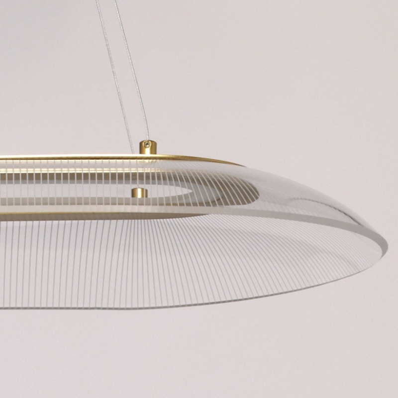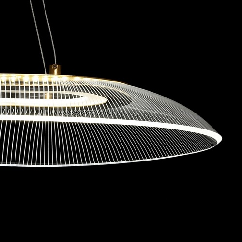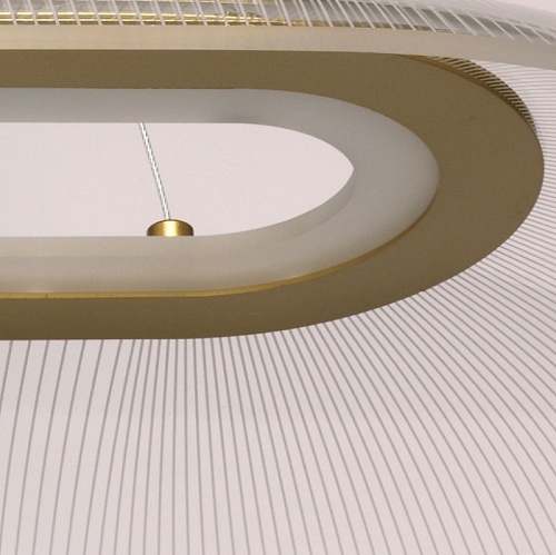 Металлическое основание подвесной люстры гальванизировано в цвет латуни. Корпус плафона выполнен из сплава алюминия с цинком и гальванизирован в цвет основания. Светодиодный источник света закрыт прозрачным акрилом с рисунком.