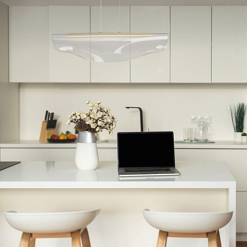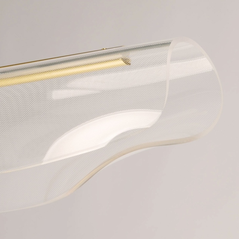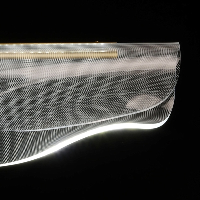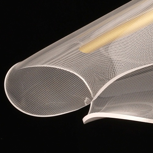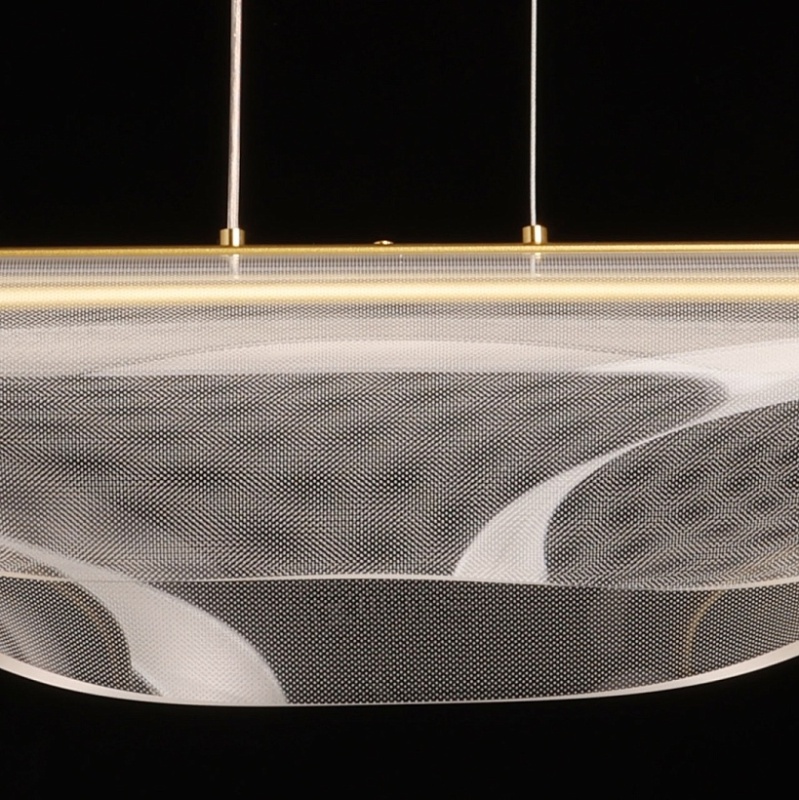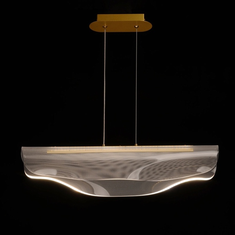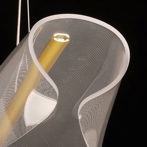 Металлическое основание подвесной люстры гальванизировано в цвет латуни. Корпус плафона выполнен из сплава алюминия с цинком и гальванизирован в цвет основания. Светодиодный источник света закрыт прозрачным акрилом с точечным рисунком.