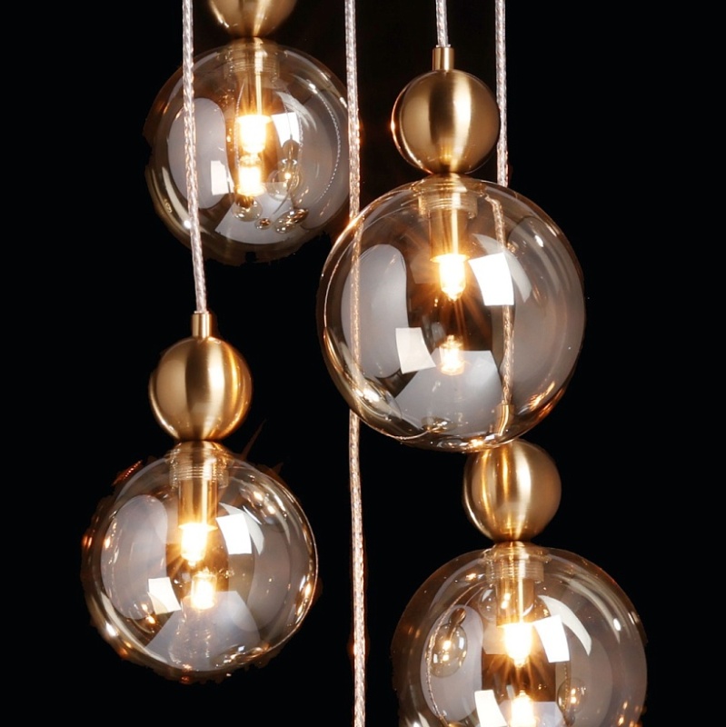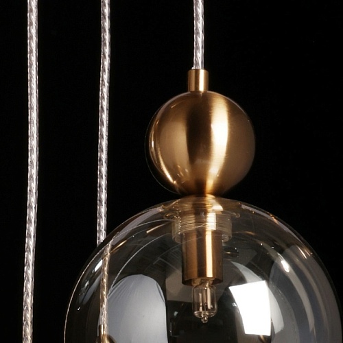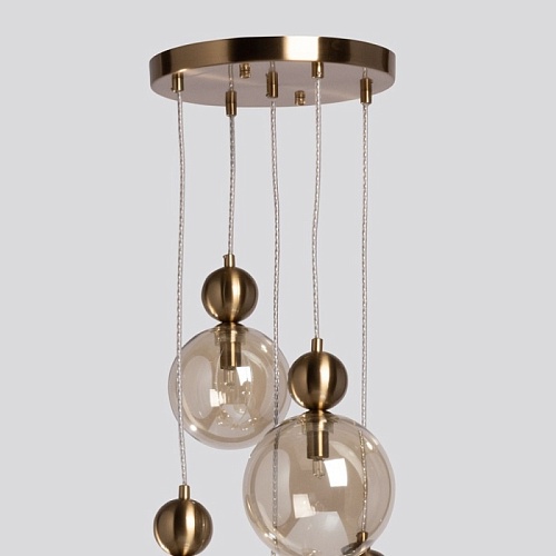 Металлическое основание подвесной люстры гальванизировано в цвет медовой бронзы. Источники света закрыты стеклянными плафонами, гальванизированными в цвет топаза.