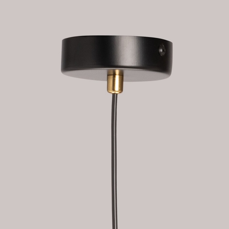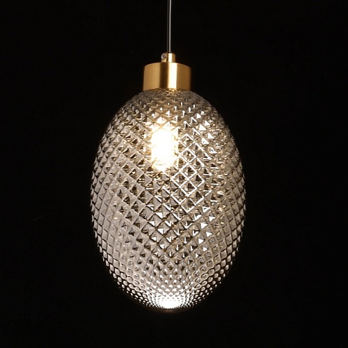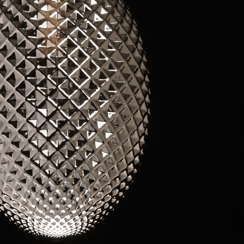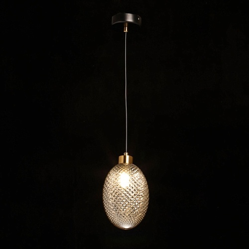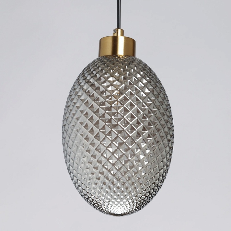 Металлическое основание подвеса окрашено в черный цвет. Отдельные элементы основания гальванизированы в цвет латуни. Стеклянный плафон отлит в сложную форму и гальванизирован в дымчатый цвет.