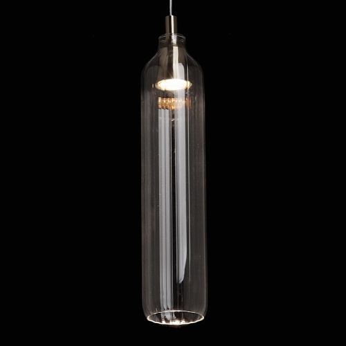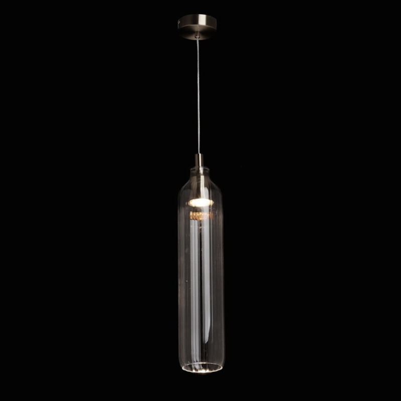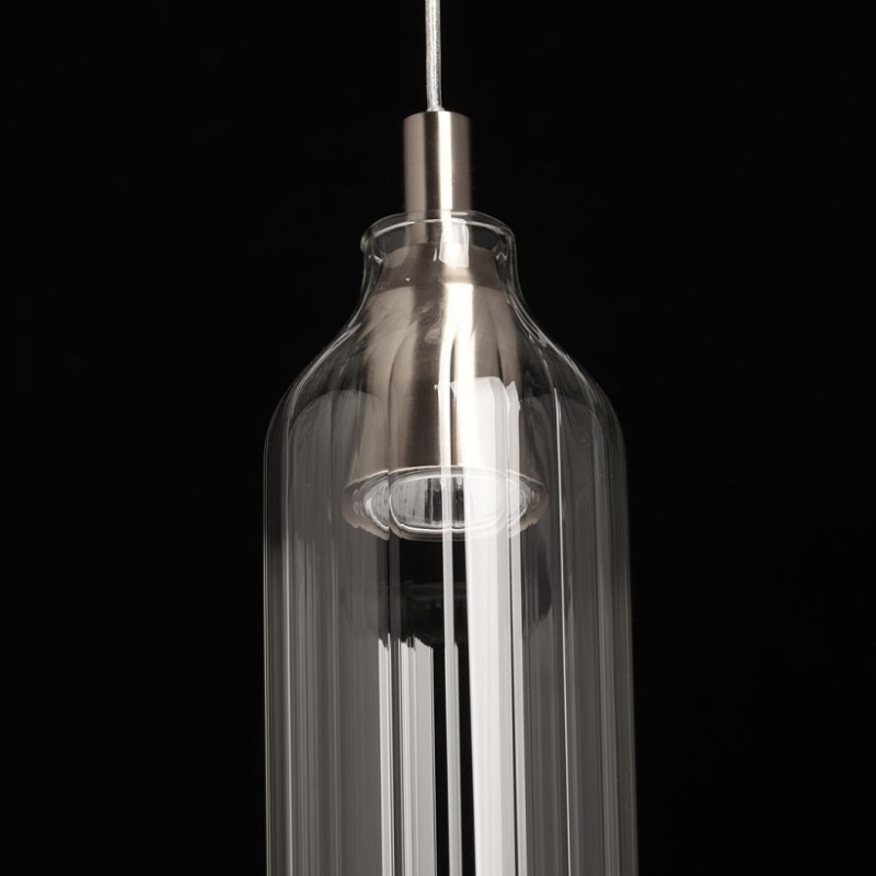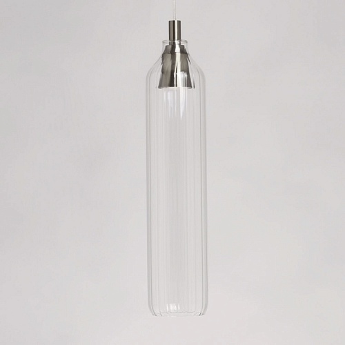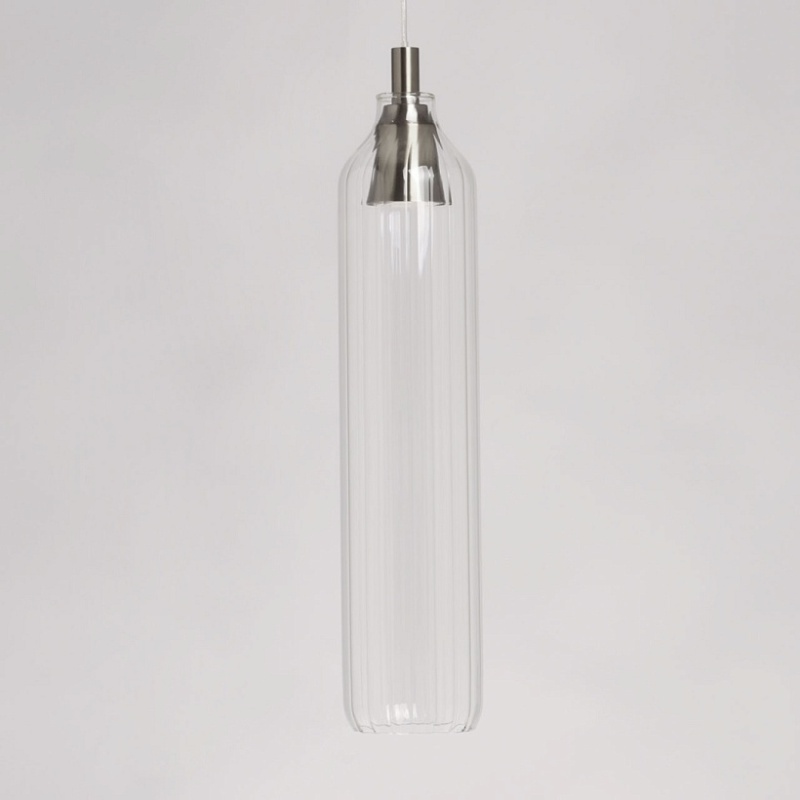 Металлическое основание подвеса гальванизировано в цвет никеля. Плафон вытянутой формы отлит из прозрачного стекла.