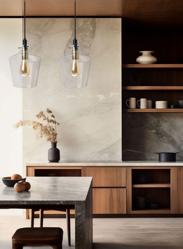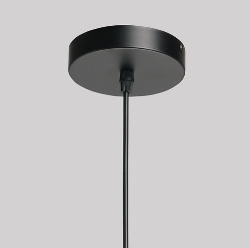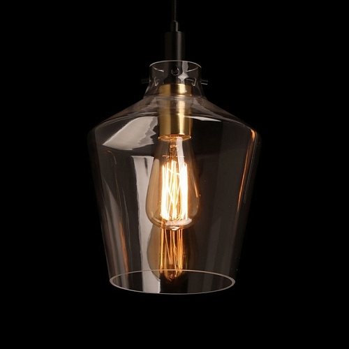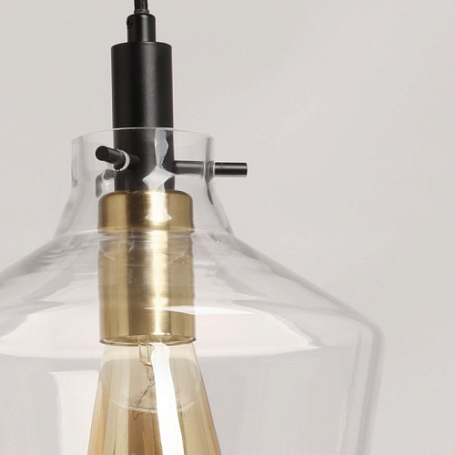 Металлическое основание подвеса окрашено в черный цвет. Отдельные элементы основания гальванизированы в цвет латуни. Прозрачный стеклянный плафон отлит в сложную форму.