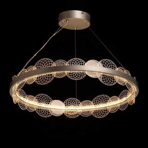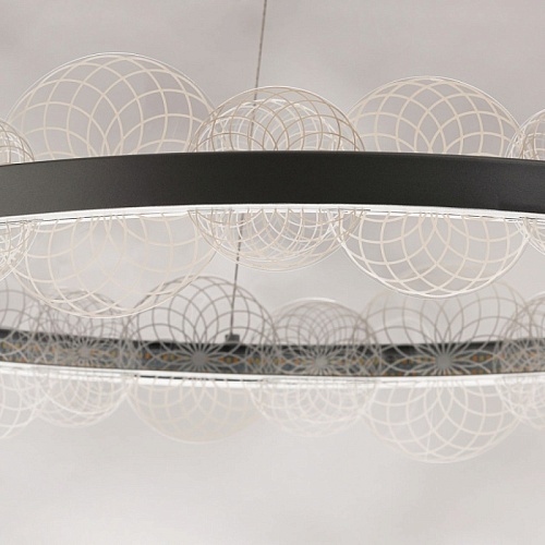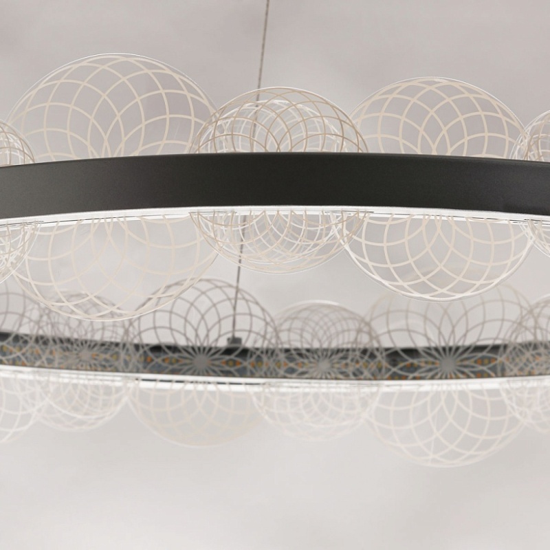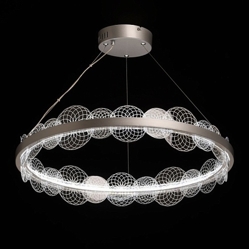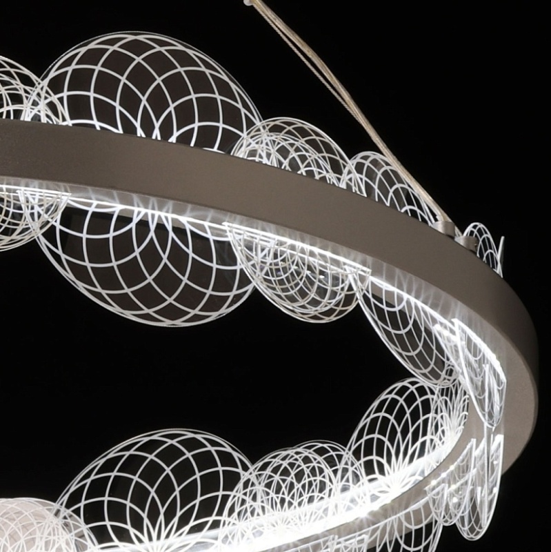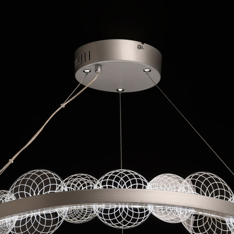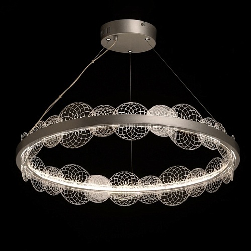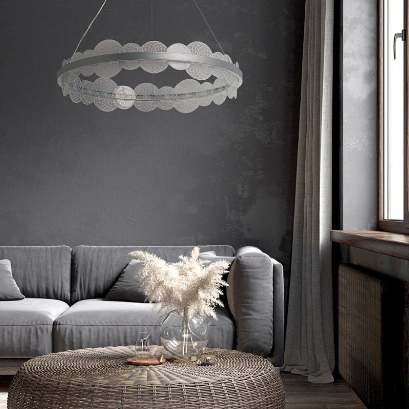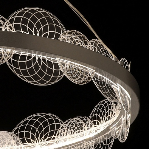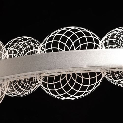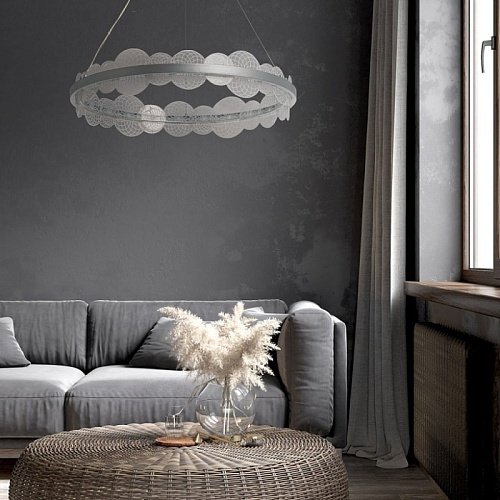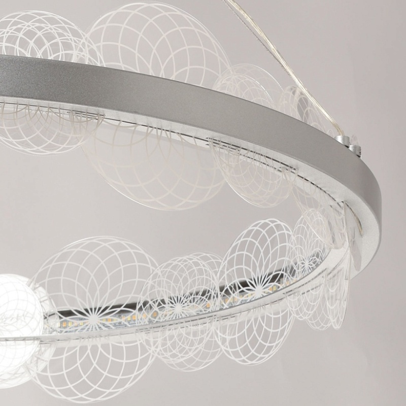 Металлическое основание подвесной люстры окрашено в цвет матового серебра. Корпус плафона выполнен из сплава алюминия и окрашен в цвет основания. Плафон декорирован прозрачным акрилом с геометричным фактурным рисунком.