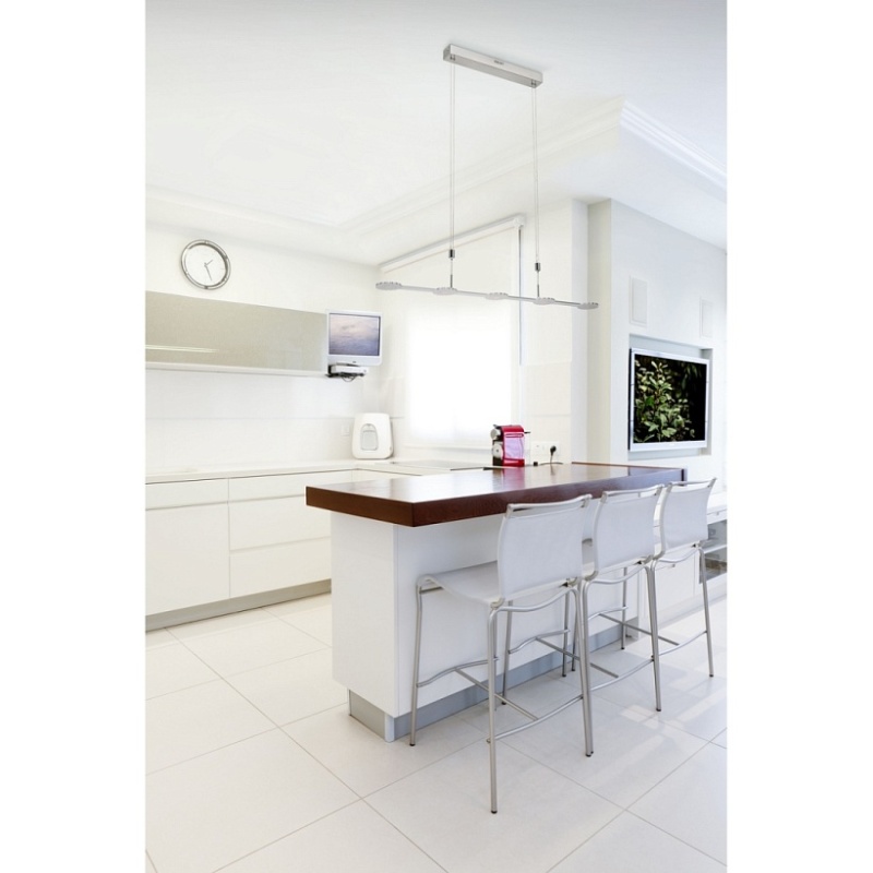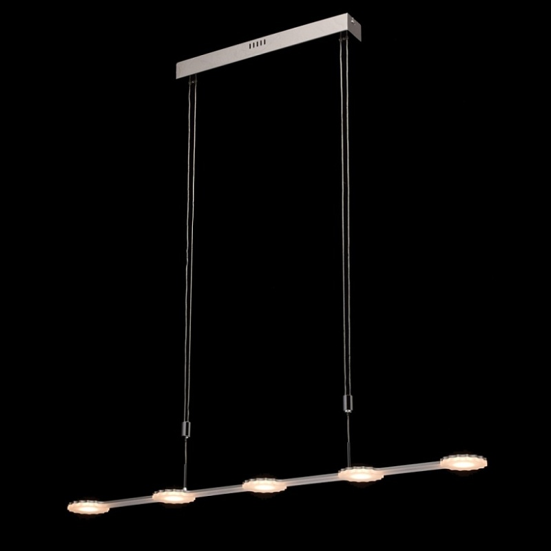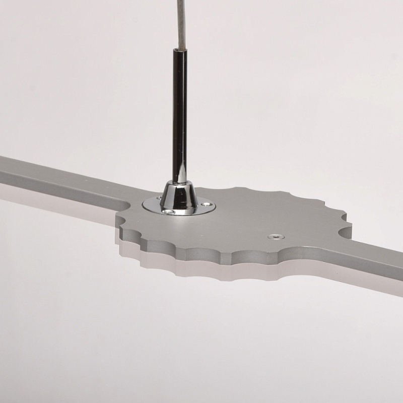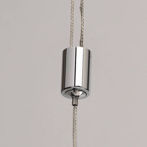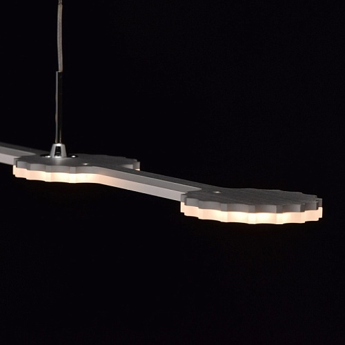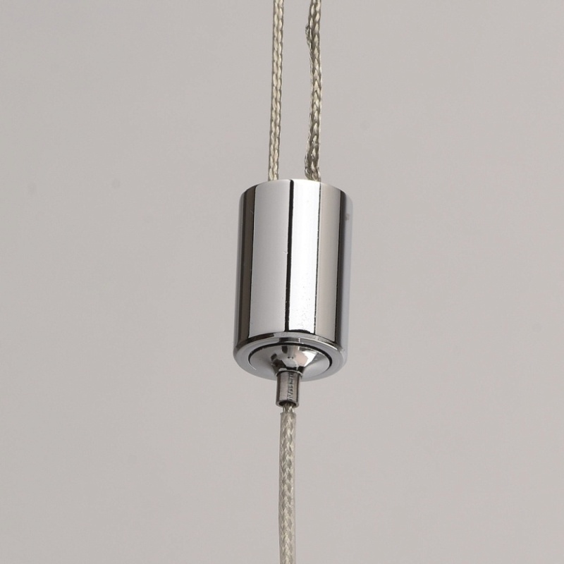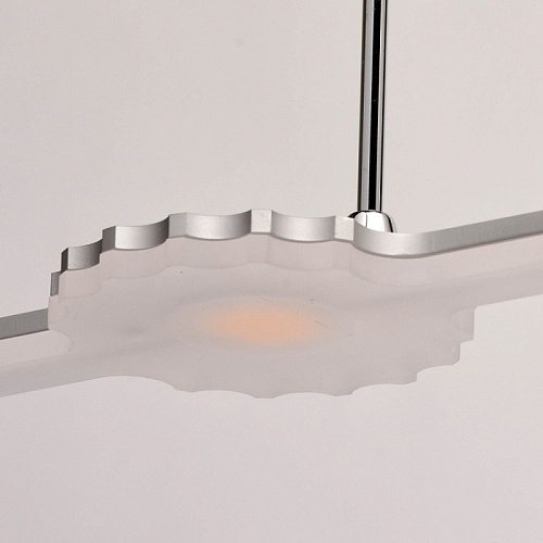 Основание выполнено из нержавеющей стали. Плафон выполнен из сплава аллюминия, круглые источники света типа СОВ закрыты белым матовым акрилом. Подвес - металлические троссы.
