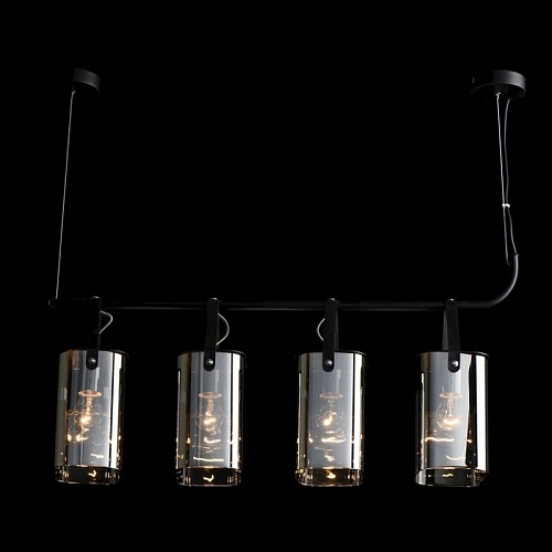 Основание светильника выполнено из металла и окрашено в черный цвет. Стеклянные плафоны гальванизированы в цвет антрацита. Плафоны крепятся к основанию на кожаных ремешках черного цвета.