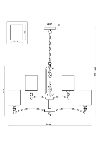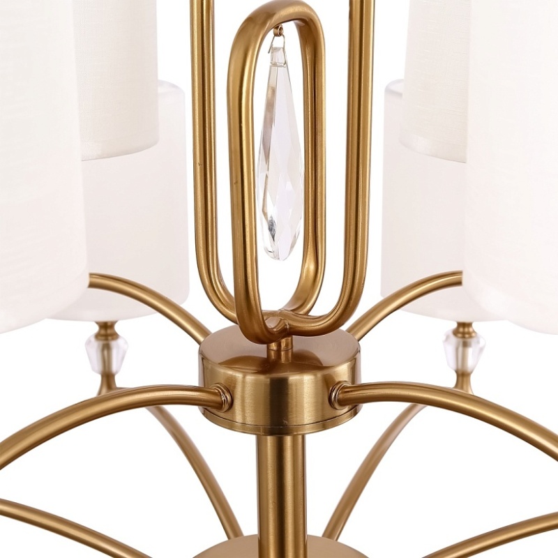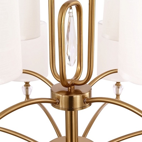 Материал арматуры – нержавеющая сталь, цвет – хром. Материал абажуров – текстиль на ПВХ, цвет – белый. Декор – прозрачное стекло. Акцентные стеклянные кристаллы на рожках со сложной огранкой.
