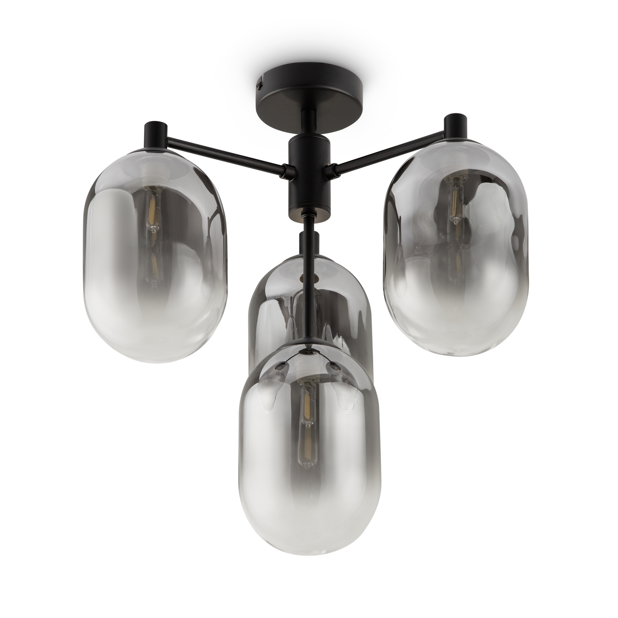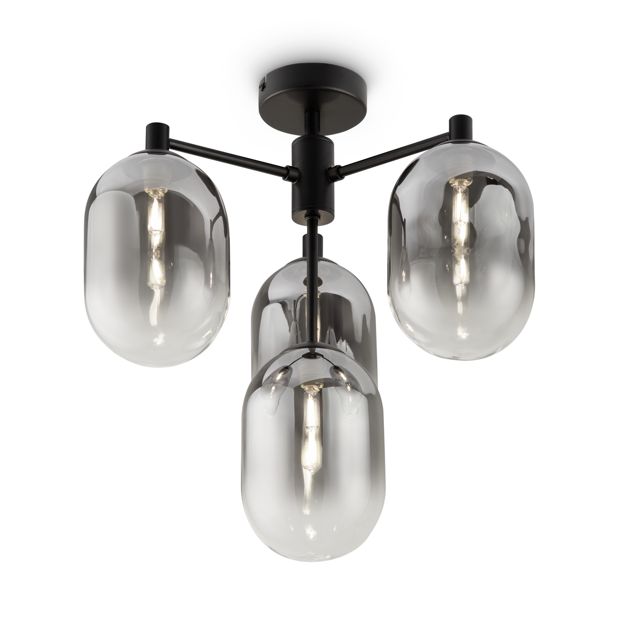 Арматура из металла матового черного цвета. Плафон из стекла с окрасом растяжка. Цвет дымчатый. Модификация — настенные, потолочные и настольные светильники. Источник света — лампа. Цоколь G9.