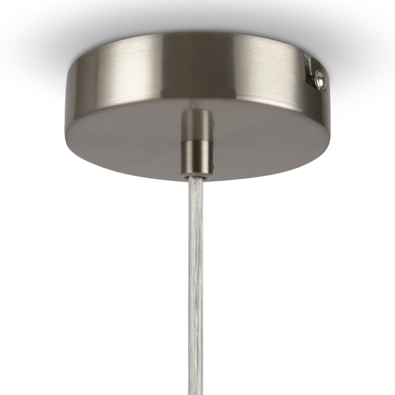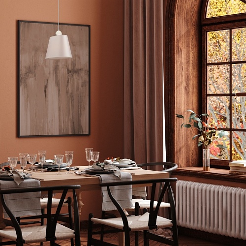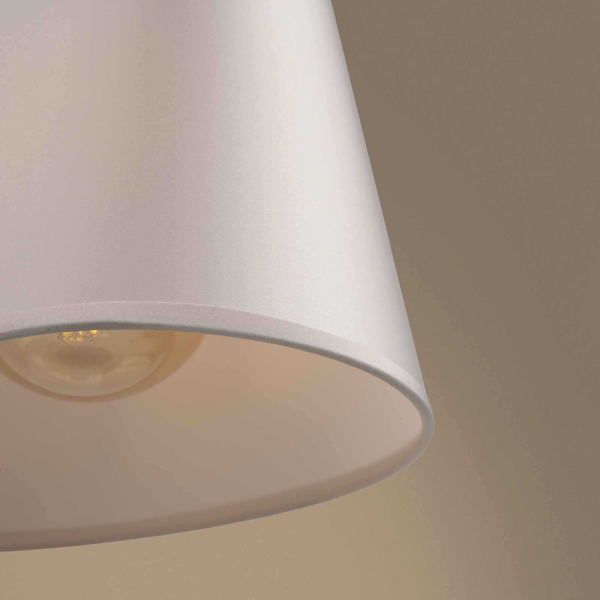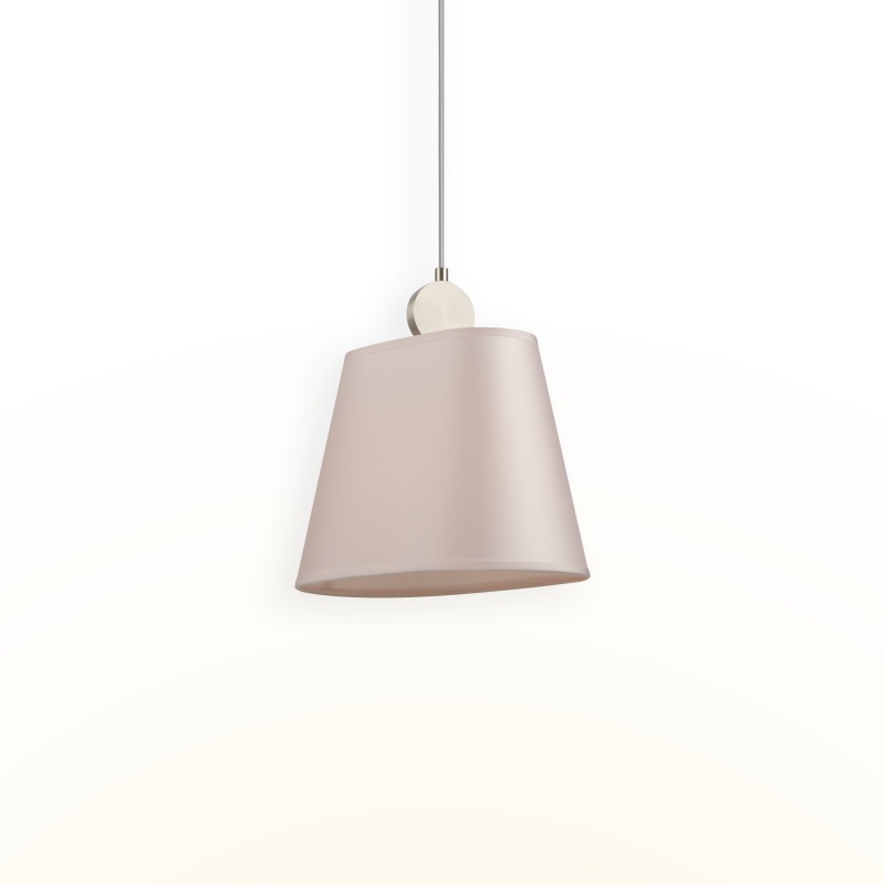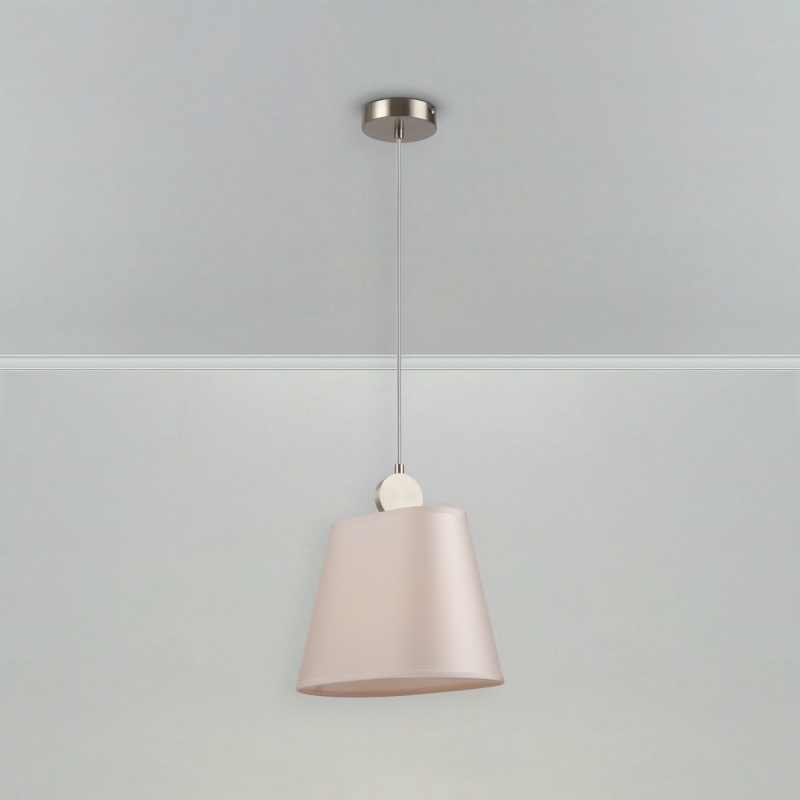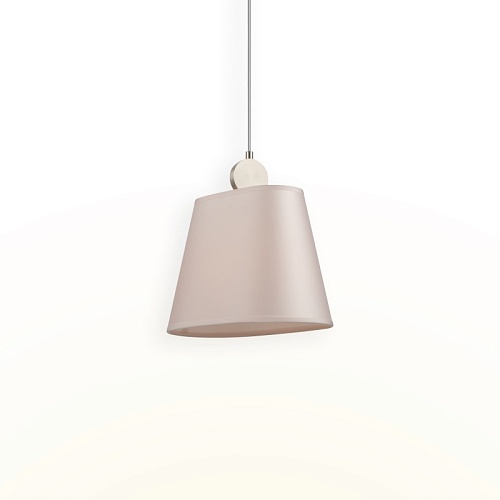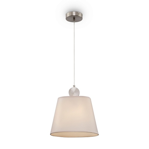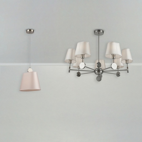 Металлическая арматура. Цвет – никель. Сатиновые абажуры оригинальной формы. Актуальное сочетание геометричных линий и округлых силуэтов. Одиночный подвес с цоколем Е27, лампа, бра и люстры – Е14.