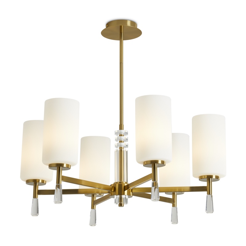 Арматура металл. Цвет латунь. Стеклянные белые плафоны хорошо рассеивают свет, направлены вверх, тем самым вытягивают потолок. Декоративные элементы в виде хрустального основания и капель из акрила. Источник света — лампа. Цоколь E27.