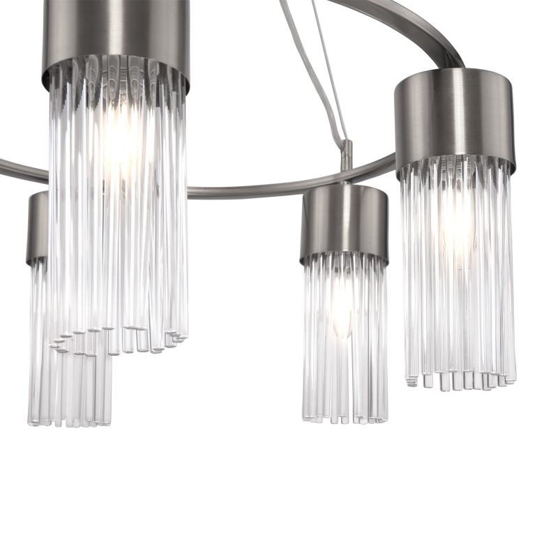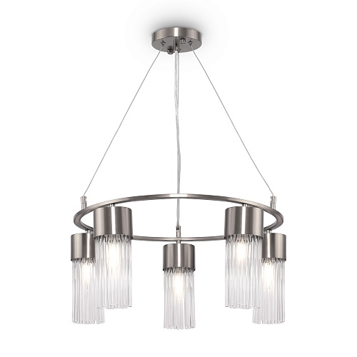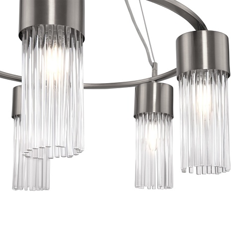 Металлическая арматура в двух оттенках: латунь, никель. Плафоны выполнены из прозрачных стеклянных трубок. Регулируемая высота. Равномерное распределение светового потока. Источник света – лампа с цоколем Е14.