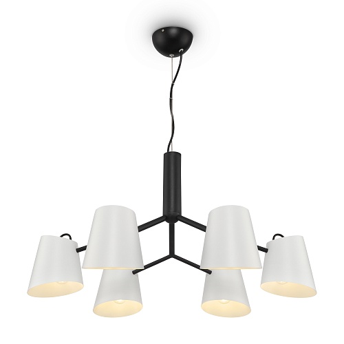 Арматура и плафоны выполнены из металла. Цвет арматуры – черный. Плафоны белого оттенка. Оригинальная форма плафонов с косым срезом. Источник света – лампа с цоколем E14.