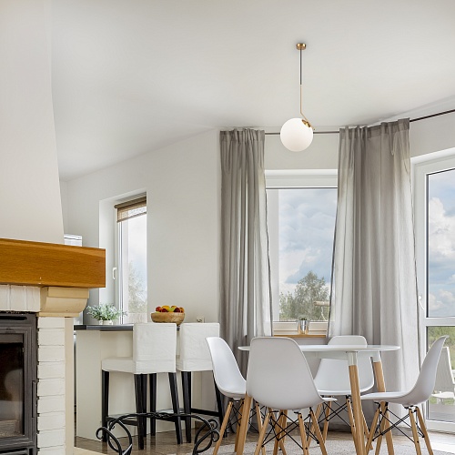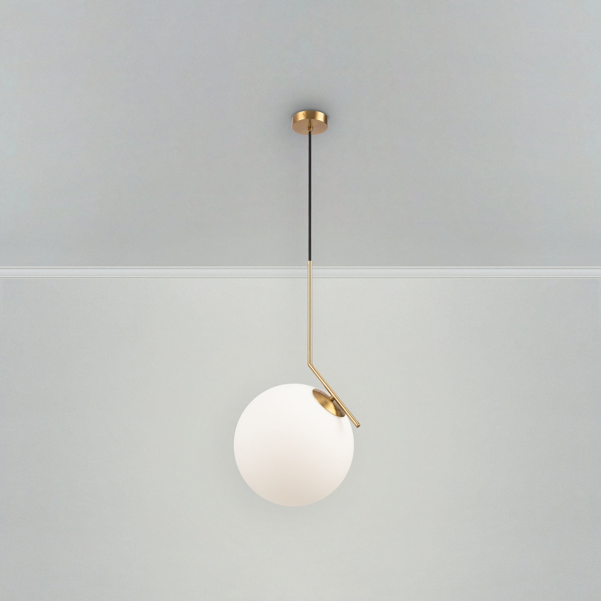 Новый ракурс и необычный угол зрения кардинально меняют представление о традиционных подвесах с плафонами-шарами. В этой серии металлическая арматура светильника изогнута под углом, ломанная линия создает яркий акцент, а сферическая форма плафона подчеркивает оригинальную геометрическую игру. Оттенок латуни и матовое стекло прекрасно дополняют друг друга. Популярный цветовой дуэт легко впишется в пространство современного интерьера. Благодаря наличию в серии светильников разного диаметра, есть возможность создать эффектную акцентную подсветку в помещении любых размеров.