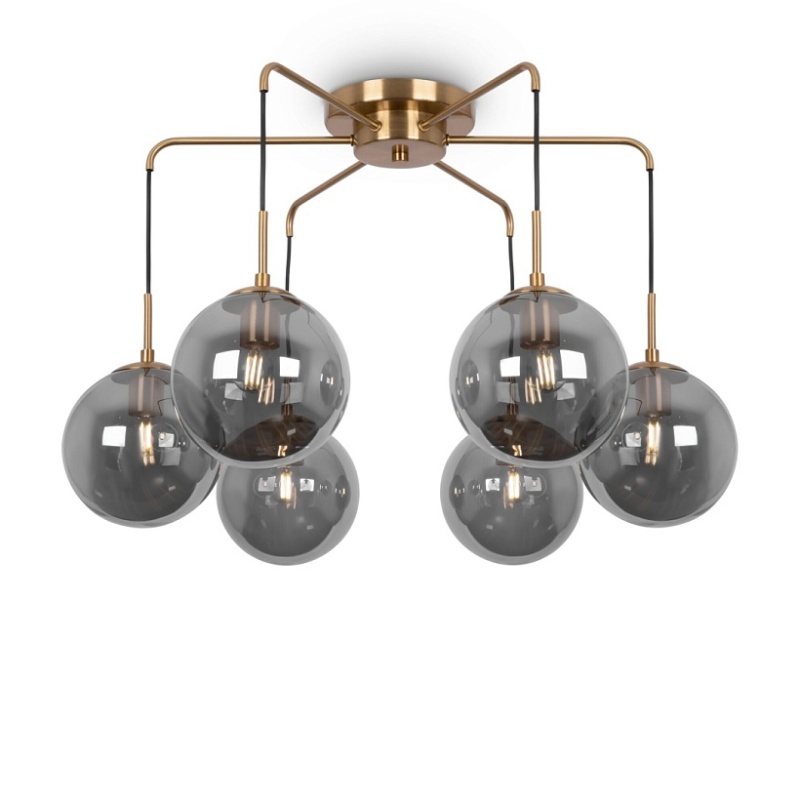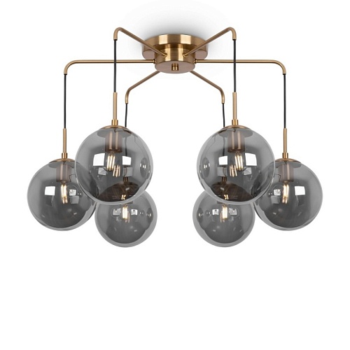Металлическая арматура. Цвет – матовый черный с золотом. Плафоны-сферы из глянцевого стекла дымчатого оттенка. Широкий ассортимент для комплексного освещения. Источник света – лампа с цоколем E27.