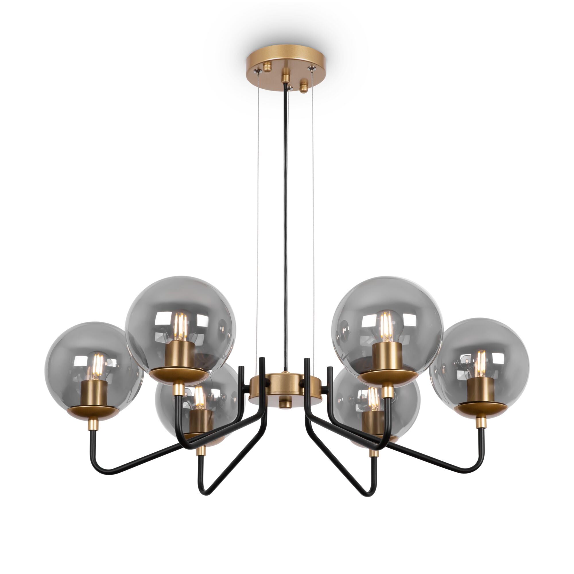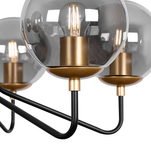 Металлическая арматура. Цвет – матовый черный с золотом. Плафоны-сферы из глянцевого стекла дымчатого оттенка. Широкий ассортимент для комплексного освещения. Источник света – лампа с цоколем E27.